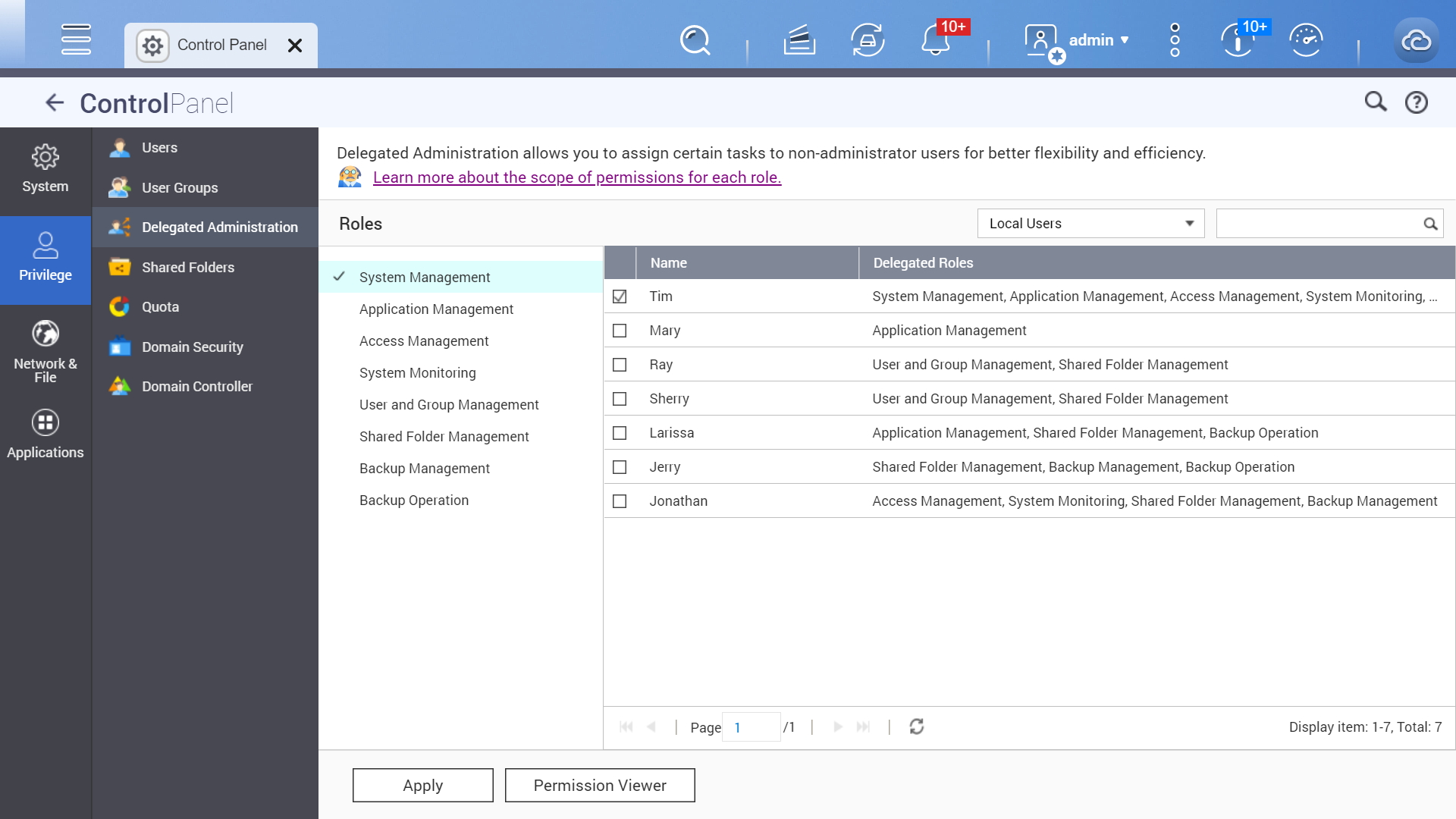 具有最高管理权限的 NAS 系统管理员 (Administrator Group Users),可针对特定 NAS 用户委派 8 种功能角色,分别赋予有限度的权限,可灵活分担管理工作,同时保障系统管理安全。对于规模不断扩大的企业组织,委派管理可协助减轻日常管理负担。了解更多委派管理