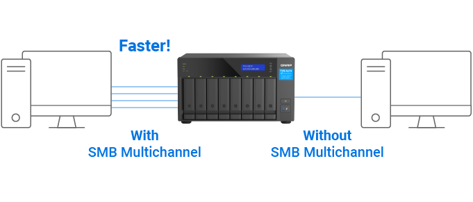 QNAP NAS 具备多网口的 2.5GbE 与 10GbE NAS 尤为适合 SMB 多重通道,让您应用加快,投资效益有感提升。