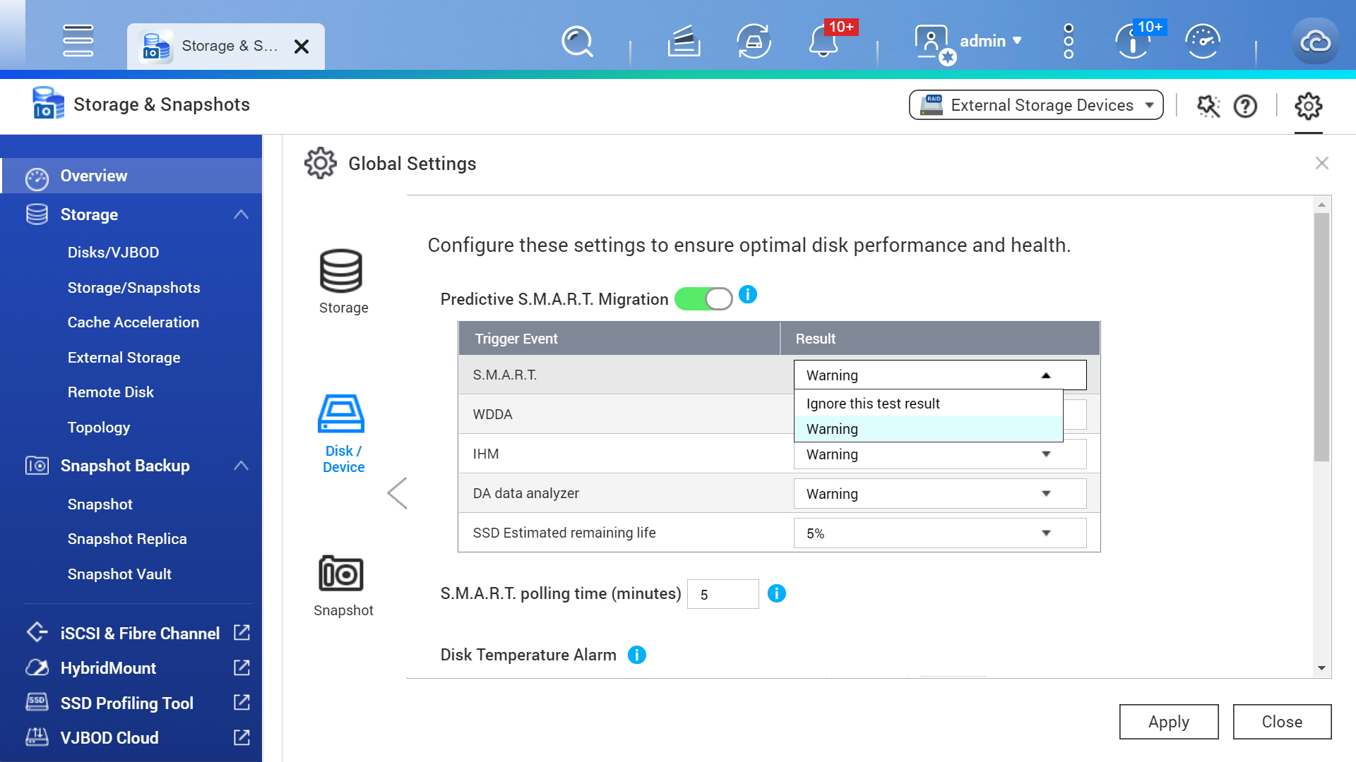您可一一为 S.M.A.R.T.、Western Digital® Device Analytics (WDDA)、IronWolf® Health Management (IHM)、DA Drive Analyzer 与 SSD estimated remaining life 等多种 HDD/SSD 健康检测工具设置触发条件,一旦触发任一条件,该硬盘数据即自动迁移到备援硬盘。