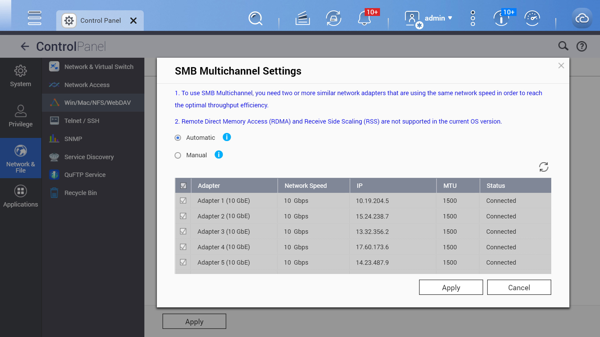启用 SMB 多重信道后,系统会自动搜索 NAS 上所有网络端口并自动聚合。无需额外繁琐配置,使用十分容易。