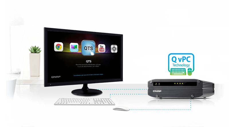 QNAP 的 QvPC 技术,其应用包含虚拟机融合、多媒体转文件、图像处理、HDMI™ 显像、云端整合、存储设备连网等技术,您只需接上键盘、鼠标、 HDMI™ 显示器等设备即可操作 IS-400 Pro。IS-400 Pro 摇身一变成为具备计算机功能的低成本、高效益设备,一机双用途,让您轻松存取存储的文件、建立 Windows/Linux/UNIX/Android 系统虚拟机执行多项应用、透过 HD Station 支持的 Chrome 或 Mozilla Firefox 浏览器上网、利用 Kodi 享受剧院般 1080p 影片搭配 7.1 声道的多媒体体验、享受 Surveillance Station 视频监控中心本地播放的便利性,及其他更多功能。