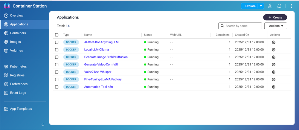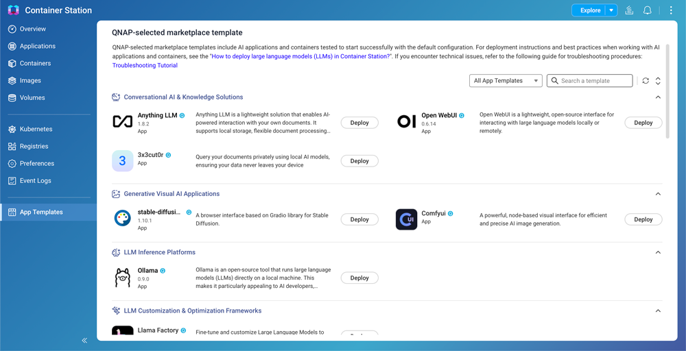 To promote practical AI adoption, the QAI series integrates Container Station with a wide selection of AI application templates. These templates support one-click deployment of popular AI tools and frameworks, with regular updatesfrom QNAP to ensure access to the latest technologies.