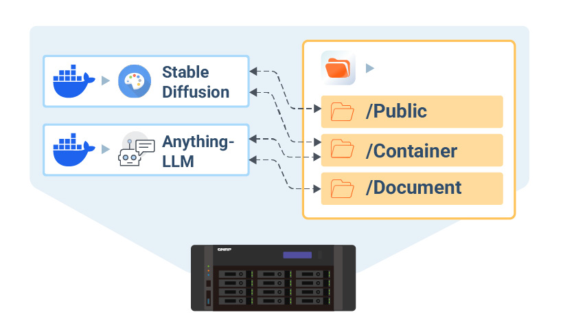 Leverage GPU acceleration via Container Station. One-click deploy Ollama, AnythingLLM, Stable Diffusion, etc. Simplifying AI application rollout.