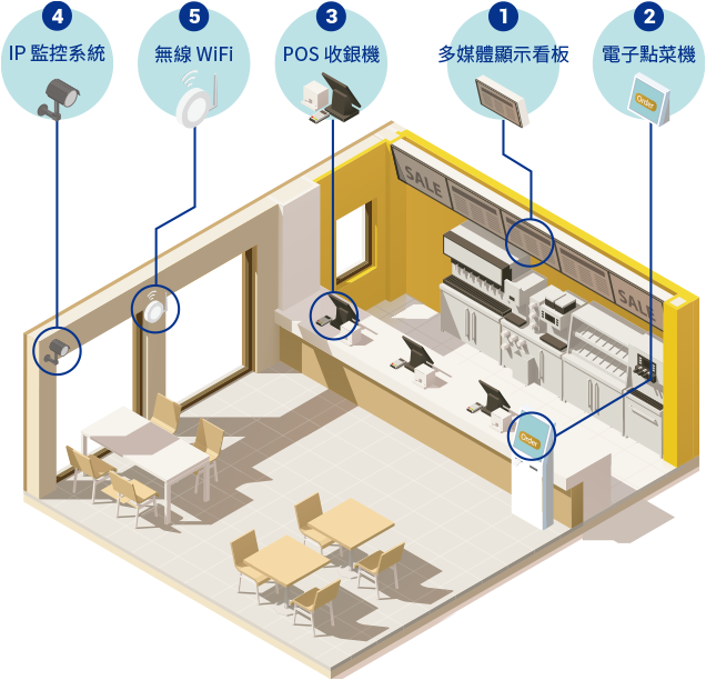 您可能希望可以使用数字显示广告牌,来弹性地展示您的新菜单或促销信息。您也需要时时确认 POS 机系统保持联机,并能妥善存储 POS 系统数据。您也需要配置 NVR 监控系统,不仅可抑制窃盗确保环境安全,更可解决顾客丢失随身物品的纠纷。现在的餐厅没有提供 Wi-Fi 就逊掉了,所以您也需要提供免费 Wi-Fi 给客人使用...