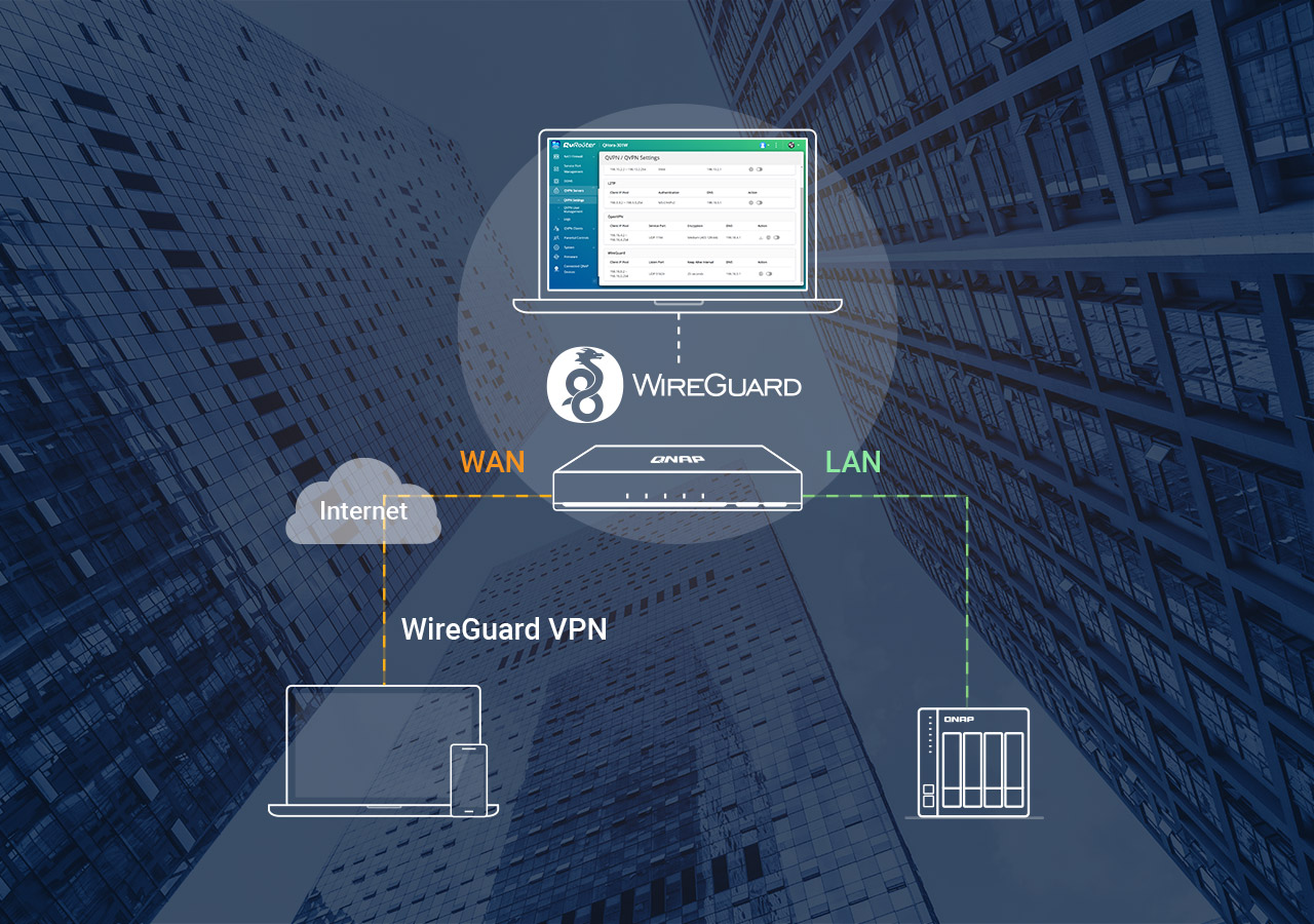 支持 QuWAN SD-WAN 技术,可与其他 QNAP 设备自动建立 Mesh VPN 组网,提供安全的 VPN 远距联机。