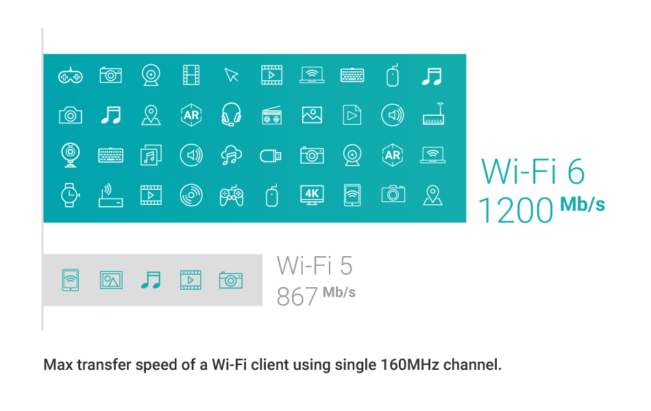 支持 Wi-Fi 6 (802.11ax) 无线传输,速度比前一代快 1.38 倍*,可同时联机设备提升 4 倍。