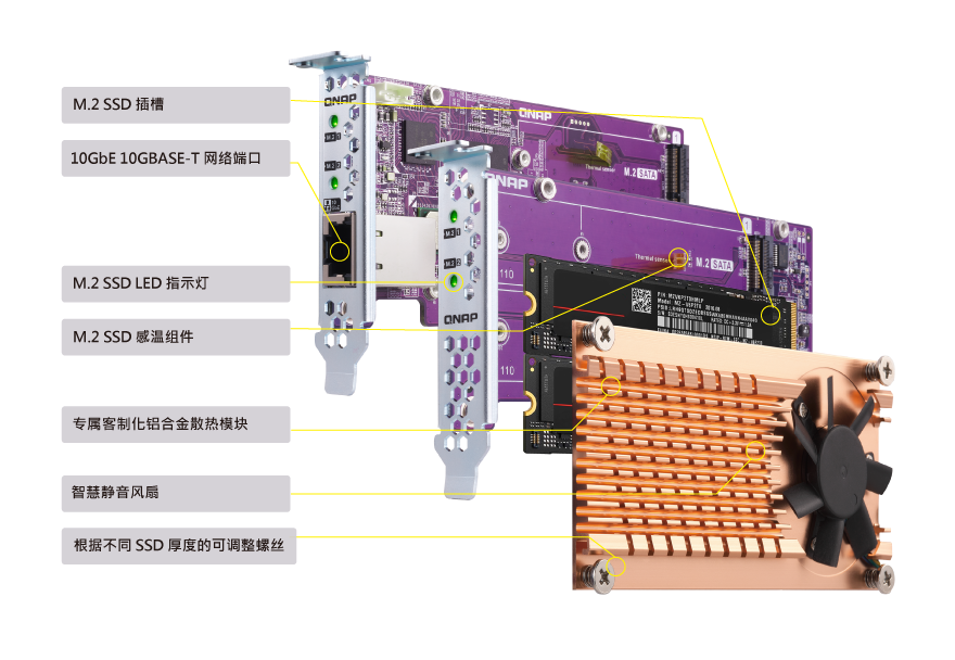 创新 QM2 扩充卡系列可安装于兼容 QNAP NAS 机种的 PCIe 扩展槽,为 NAS 增添 M.2 NVMe SSD 配置与扩充 10GbE RJ45 网络联机。QM2 将 SSD 与 10GbE 扩充功能合而为一,不仅显著提升 NAS 整体效能,亦为建立 10GbE 高速传输环境的经济选择。