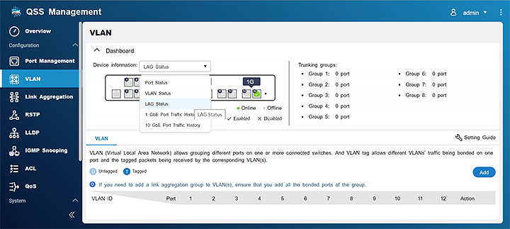 QSW-M1208-8C 搭载 QNAP Switch System (QSS) 系统,提供简洁的图形化 Web 管理接口及实用管理功能,让网络管理变得更加直觉容易。