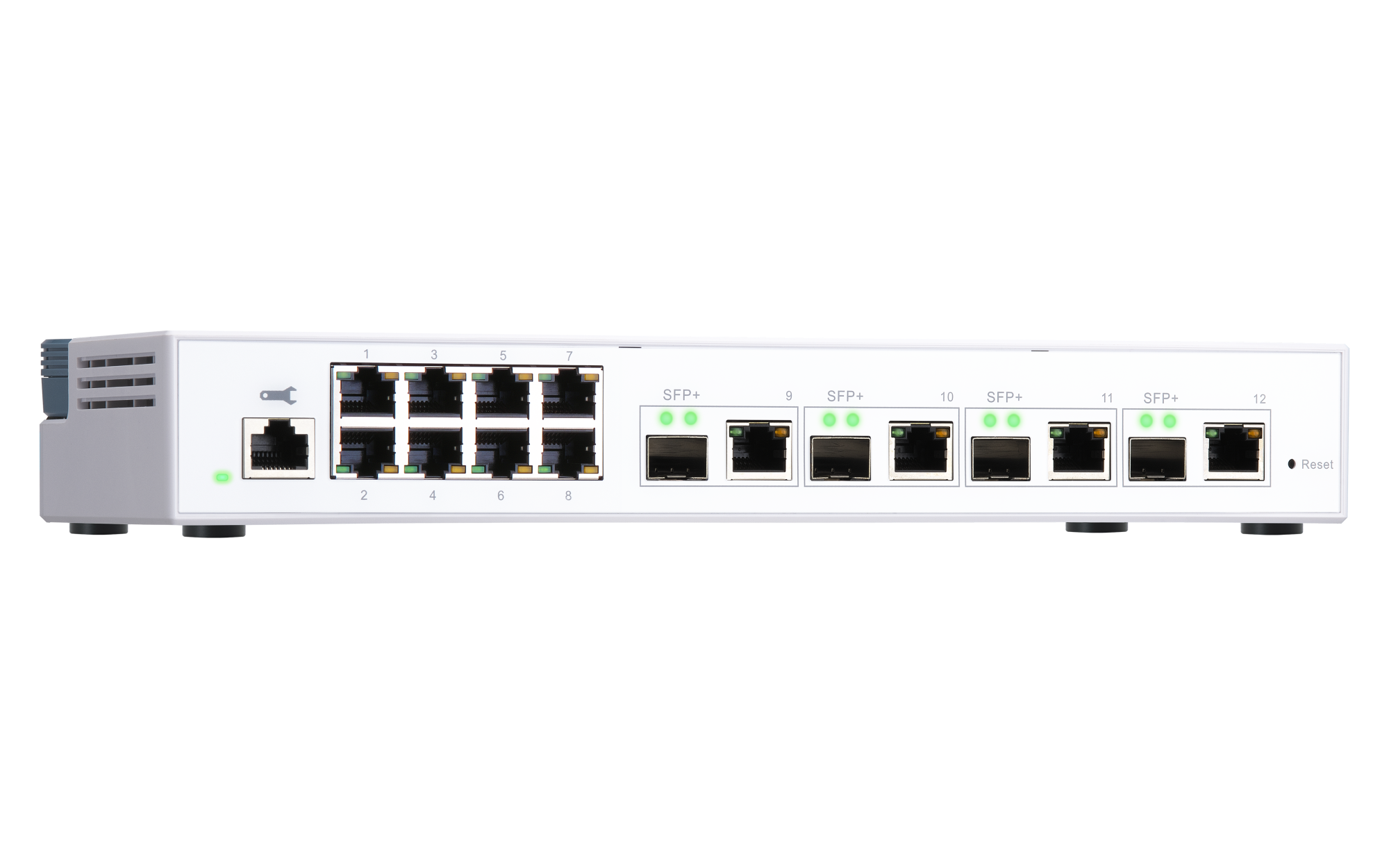 管理类型 网页管理型 端口数量 12 10GbE SFP+/RJ45 复合埠 4 注:10GbE SFP+ 埠与 1GbE SFP 回溯相容;RJ45 (铜缆) 复合端口支持速度达五种 (10G/5G/2.5G/1G/100M)。1GbE (RJ45) 8 电源供应器描述 电源转接器 最高耗电量 31.46 W 输入电源类型 AC 输入电压范围 100-240VAC、50/60Hz MAC 地址表 16K 总无壅塞流量 48Gbps 交换容量 96Gbps 管理接口 网页 控制台 RJ45 风扇 PWM 双滚珠轴承风扇 x 1 Sound Level < 21 db(A) 支持标准 IEEE 802.3 以太网