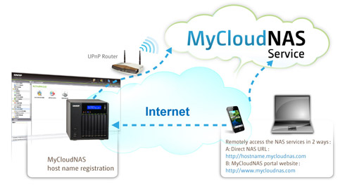 MyCloudNAS服务是可提供您远程联机至NAS的一项功能。透过此项服务,您可为NAS申请一个易记的域名,其会将此域名对应至NAS的IP地址,甚而自动帮您设定完成UPnP 路由器上的埠号转址服务。经由管理接口上内建的「MyCloudNAS设定精灵」,即可透过六步骤完成所有设定,并与亲朋好友分享你NAS上的影音档案,简单又快速。设定完成后, 您即可随时随地的透过MyCloudNAS服务联机至您的NAS上。