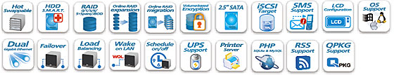 SS-839 Pro 搭载Intel Atom 1.6GHz CPU、2GB DDRII 内存,并支持RAID 0/ 1/ 5/ 6/ 10/ 5 + hot spare,10+spare, Single及JBOD。支持在线RAID容量扩充及RAID组态迁移的功能。