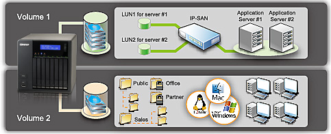 对中小企业而言,针对现在使用中的服务器能够拥有一个理想的高性能及存储空间扩充解决方案是必要的。然而,目前市面上大部分相关产品,不是不够有效率的应 用 (如:DAS,Direct Attached Storage) 就是所费不赀及过于复杂 (如:Fiber Channel SAN)。威连通的SS-839 Pro 能够同时支持NAS及iSCSI 装置,提供建置IP-SAN一个低成本及有效率的解决方案。服务器管理员能够使用内建的iSCSI 装置服务建立大量八组装置。不同的iSCSI逻辑单元数(LUNs: Logical Unit Number) 能够做为现有存储空间的扩充或是现存应用服务器 (如:数据库服务器、电子邮件服务器)的备份位置。