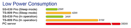 SS-839 Pro 是目前市面上小型的 8-bay NAS,因此可轻易地配置在办公室的任何角落。它有着相当好的散热及低噪音设计,为一节能的存储装置。配备 8 颗 500 GB 硬盘,设为 RAID 5 的 SS-839 Pro 耗电量只需 34 W,可帮您节省许多的电费支出。