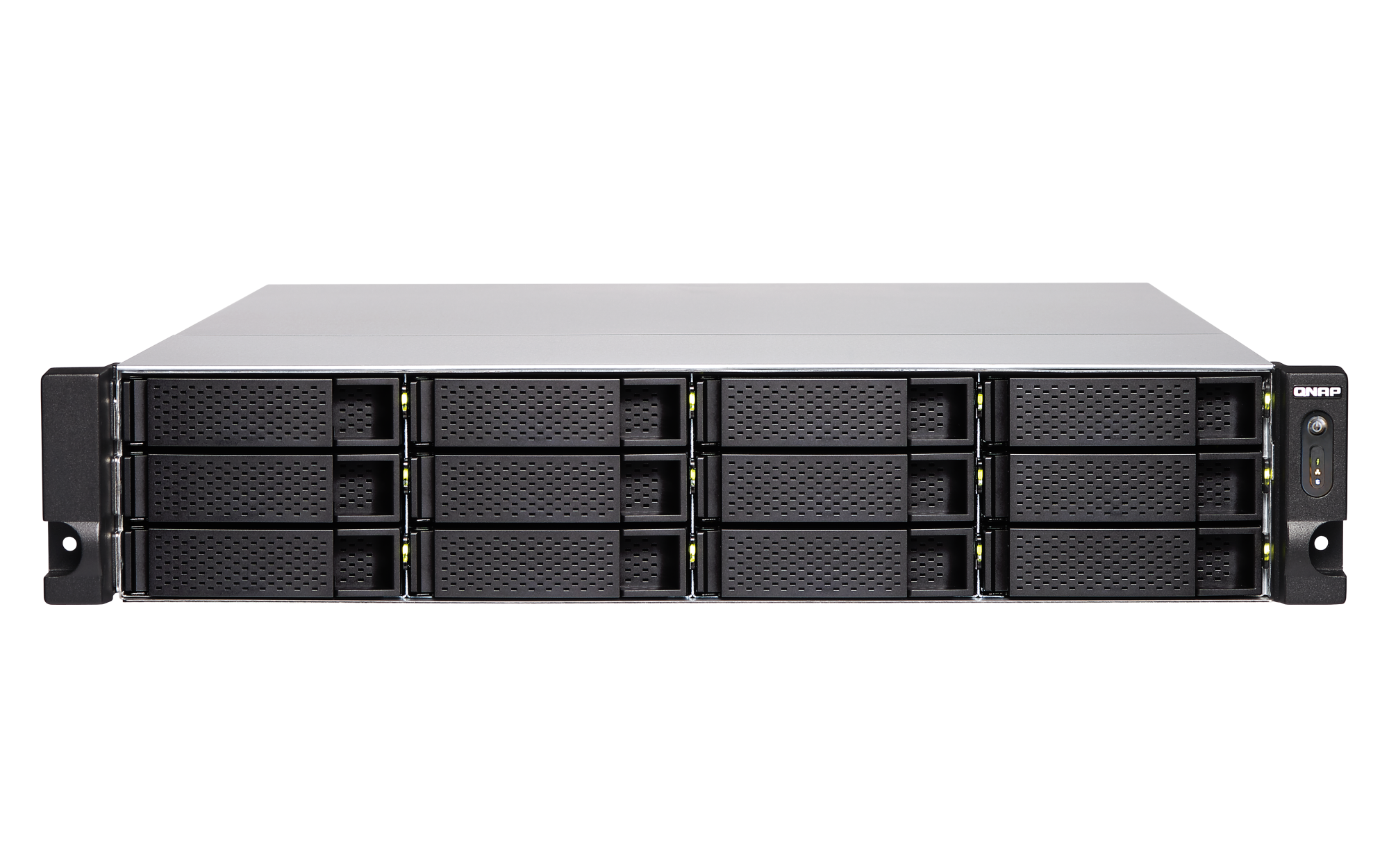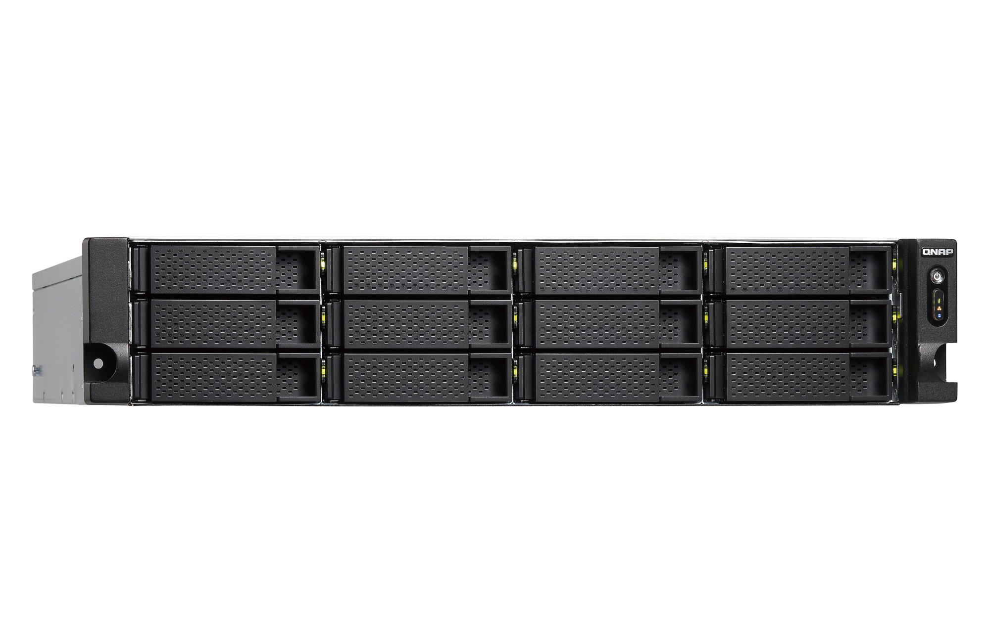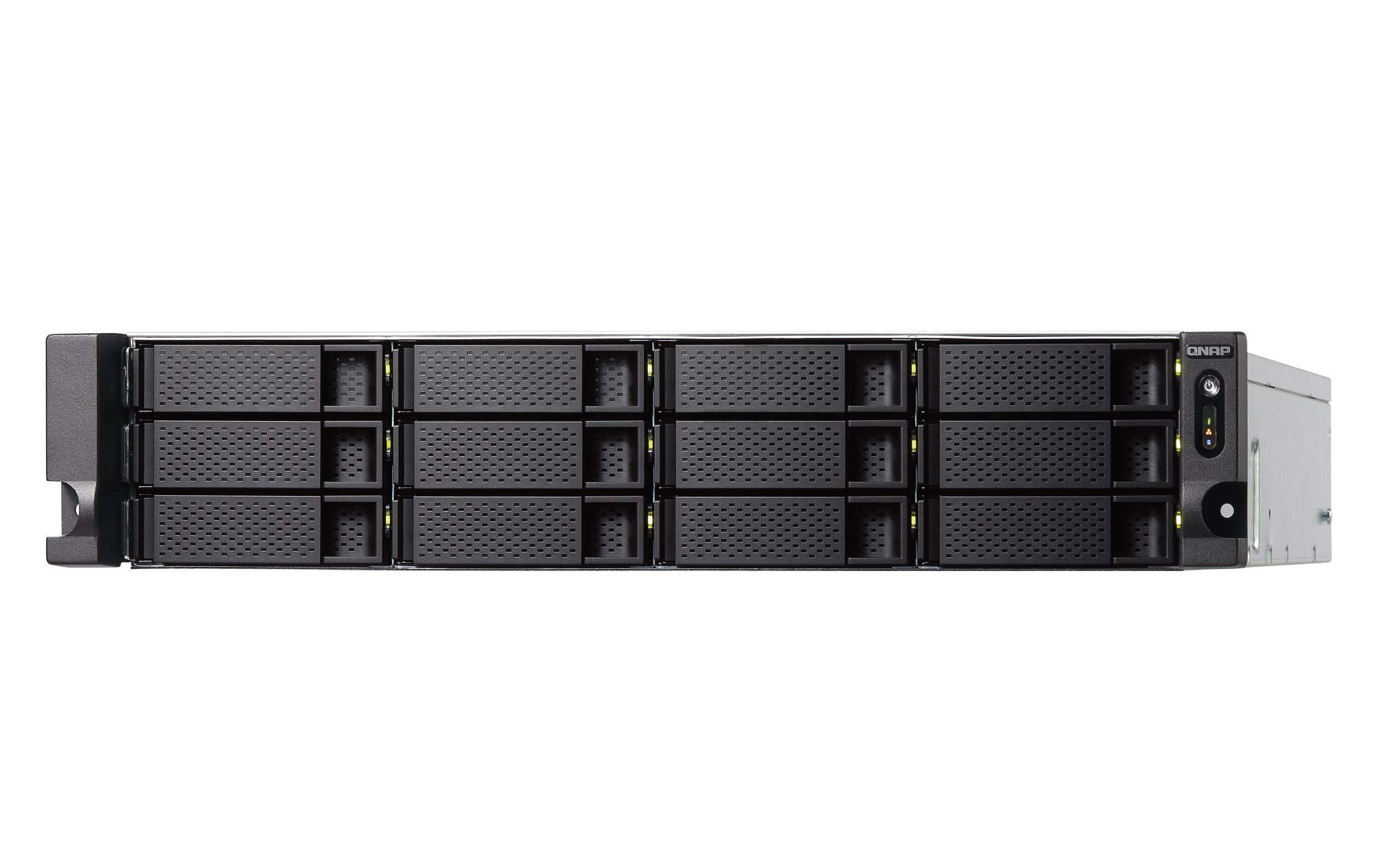 1 x Type-A USB 3.2 Gen 2 10Gbps外形规格 2U 机架式 LED 指示灯 HDD 1-12、状态、局域网、存储扩展端口状态 按钮 电源、系统重置 尺寸(高 x 宽 x 深) 88.3 × 482 × 562 mm 不包括耳钩与电源供应器的突出部分。净重 13.73 kg 毛重 16 kg 工作温度 0 - 40°C (32°F - 104°F) 存储温度 -20 - 70 °C (-4°F - 158°F) 相对湿度 5-95% RH (不凝结),湿球:27˚C (80.6˚F) 电源单元 300W (x2), 100 - 240V 功耗:典型工作模式 106.66 W NAS 装满硬盘的状态下所测试。风扇 系统风扇:2 x 70mm,12VDC 系统警告 蜂鸣器 标准保修 3 较大并发连接数(CIFS)- 配备内存上限 5000 注意:请仅使用 QNAP 内存模块来保持系统的性能与稳定性。若 NAS 设备有多个内存模块,请使用规格相同的 QNAP 模块,并参考硬件用户手册安装兼容的 QNAP 内存模块。