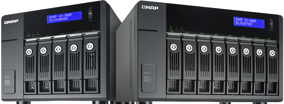 随着您的事业成长,您的存储需求也会随之增加。您可使用 QNAP 网络虚拟存储扩充柜 (Virtual JBOD, VJBOD) 技术,以 TS-1635AX 的闲置存储空间扩充其他 QNAP NAS 的存储空间,或是使用1 台 UX-800P 或 UX-500P 存储扩充设备来扩充 TS-1635AX 的存储空间。