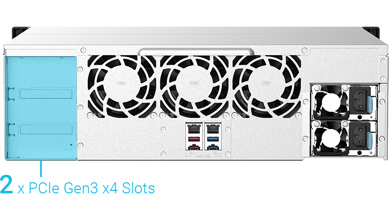 TS-1673AU-RP 配备 2 个 PCIe Gen3 x4 插槽,并可额外购买选购配件将原本双 PCIe 插槽配置转换成速度更快的单 PCIe Gen3 x8 插槽,可依您的需求弹性配置扩充卡,让应用更广、效率更高。