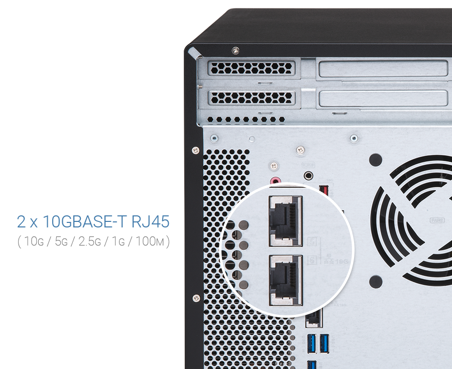 内建双端口 10GBASE-T (RJ45) 网络孔,高带宽加速虚拟化应用,以及高画质影音编辑与分享。