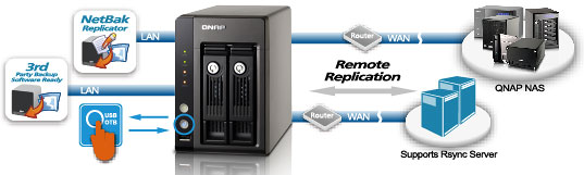 - 加密异地备援:Turbo NAS的数据可以透过网络加密备份到其他的QNAP NAS系列产品。