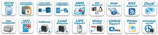 网络自动IP联机过滤 为防范NAS遭受到网络恶意入侵,服务器管理员能够建置允许、拒绝或是自动封锁透过SSH/ Telnet/ HTTP(S)/ FTP/ samba/ AFP的自动联机过滤机制,更加强化网络的安全防护。 功能强大的系统管理工具 远程唤醒 (Wake on LAN) 用户能够用远程遥控的方式唤醒在局域网络内的NAS。 智能型风扇 风扇的转速能够根据目前的系统温度自动地做调整。管理者同时能够透过手动定义高转及低转的设定。 实时SMS/ Email警讯通知 服务器管理员可以透过SMTP及SMSC(Short Message Service Center)的设定,立即接收实时Email及简讯通知,随时随地轻松掌握NAS的新一代状态。 支持SSL (Secure Sockets Layer)安全凭证 管理者能够上传经认可的安全凭证及X.509PEM格式的RSA私人密钥让使用者能够透过SSL登入来存取NAS的数据。 支持系统日志(Syslog)服务器设定 透过此设定,所有NAS的事件记录及联机纪录能够被存储到远程系统日志(Syslog)服务器中。 网络回收站 在NAS网络文件夹里删除的档案将会被移到特定的资源回收文件夹。透过这样功能,您可以随时回存您不小心删除的档案。 巨细靡遗的事件管理系统 Turbo NAS的所有联机记录,包括samba、FTP、AFP、HTTP、HTTPS、Telnet及SSH,以及透过网络服务登入系统的在线用户联机信息等,让管理者能够容易管理并掌握所有的详细状况。 详尽的系统信息 服务器管理员能够透过管理者使用页面掌握详尽的系统信息,例如:CPU使用率、所有内存及可使用的空间、发送接收及错误的封包数、系统开机、CPU温度、系统温度、硬盘温度及系统风扇的转速等。 安全监控中心 威连通的安全监控中心(Surveillance Station)直接授权可同时搭配2支网络摄影机(IP Camera),让使用者能够透过因特网设定及做远程管理,其中包含实时监控录像(real-time monitoring recording)、透过IE浏览器观看实时影像(Live View),播放(Playback)及事件记录(Log)等。另外,安全监控中心亦有贴心设计的进阶录像功能设定包含连续录像(Continuous recording)、位移侦测录像 (Motion-detection recording)及排程录像(Schedule recording)等,让使用者可以根据不同时段的需求,选择欲执行的模式,在达到安全监控需求的同时,亦能够兼顾NAS效能、节省硬盘存储空间及达到环保节能等多重效果。透过安全监控中心,所有的录像档案将以AVI文件格式存储,并支持时间戳(Time Stamp),使用者能容易地做档案搜寻且直接使用Windows Media Player播放。 支持最广泛网络摄影机品牌的网络安全监控方案 QNAP 网络磁碟机的安全监控中心支持市面上多款品牌的网络摄影机并通过实验室严格的兼容性与信赖性测试,包括了AXIS、D-Link、IPUX、LevelOne、Linksys、Panasonic 及Vivotek等。搭配特定型号的摄影机,使用者亦能够透过网页执行双向影音监控录像(Two-way video & audio),智能型PTZ操作(Pan, Tilt, Zoom)来控制监控的方位。 软件扩充及网站管理 网页服务器 Turbo NAS拥有MySQL及SQLite的双支援,内建phpMyAdmin及Joomla!,SOHO族及专业玩家能够轻松地架设属于个人化的交互式网页。php.ini 可编辑的支持,让使用者在设定时可以免去传统安装Windows-based服务器的麻烦。此外,您也可以自行开发或是安装下载open-source的应用,像是架设购物网站、论坛、部落格等。 MySQL服务器 Turbo NAS是您作经济实惠的的数据库服务器的选择。它可以应用成为另一个在远程的网页服务器,也可以成为另一个额外的备份数据库。 内建支持动态域名系统 (DDNS: Dynamic Domain Name Server) Turbo NAS支持DDNS,您可以透过DDNS服务的供货商,注册特定的域名,并将其指定到Turbo NAS。这样一来您就不再需要去记冗长的IP位置了 透过QPKG平台扩充Turbo NAS新应用 QNAP新推出的QPKG 平台让使用者不用经由繁杂的程序,便能够透过简单的下载与安装,享受来自全球社群所开发的相关软件套件来扩充Turbo NAS的应用。  |