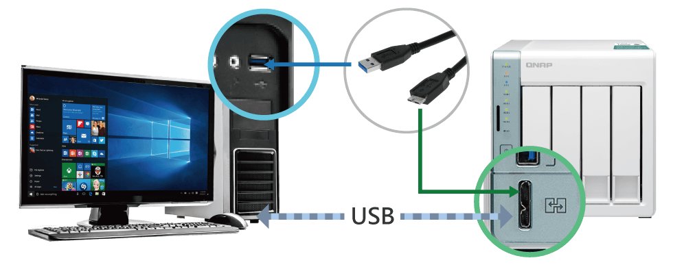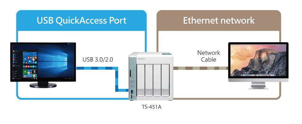 TS-451A 的新颖设计,让您毋须透过网络与繁琐的设定,只需使用选购的 USB 3.2 Gen 1 A 公 – Micro B 公传输线材或是 USB 2.0 Micro B 传输线材*,搭配 Qfinder Pro*,即可完成的安装及设定,并便利存取与传输 TS-451A 中的数据。您可以透过 TS-451A 前面板的 USB 3.2 Gen 1 Micro-B 快速存取埠 (USB QuickAccess) 直接连接至 PC 或 Mac 计算机装置,并在 Qfinder Pro 中找到 TS-451A,接着完成安装,并直接存取 NAS 共享文件夹。不必再受限于复杂的网络设定,人人皆可轻松使用;更可以弹性设定数据访问权限,保护数据安全无虞。