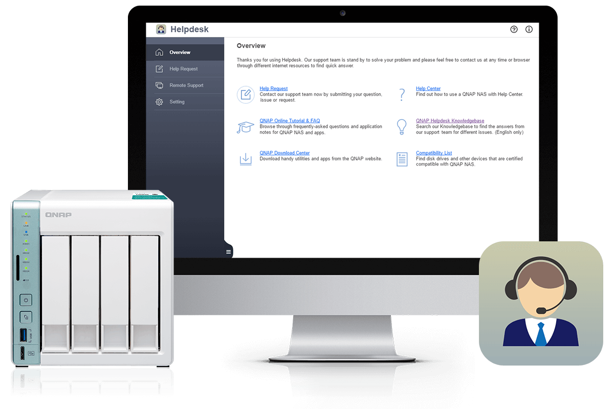 无论是技术上的需求或是产品功能的建议,现在,您有更畅通、及时的管道与 QNAP 联系。透过 QTS 内建的 Helpdesk 支持平台,您可直接发送问题与支持需求给服务工程师,另可启用远程支持,让工程师以安全 (256位 SSL 加密联机) 暨保密的方式由远程协助您迅速解决 NAS 问题。Helpdesk 罗列各式常用教学、常见问题、在线资源、兼容性列表,与 QNAP 支持团队的知识库,即便您是先一步次使用 NAS,也可利用这些资源处理您所遇到的各式问题。