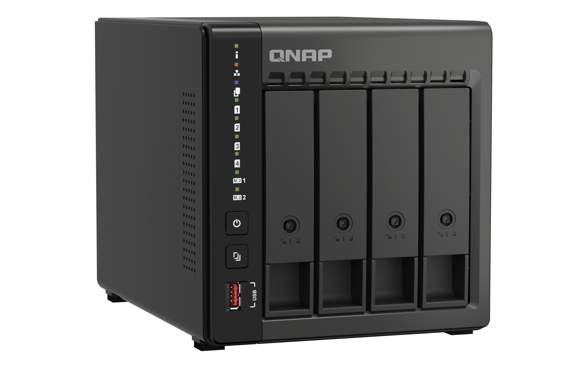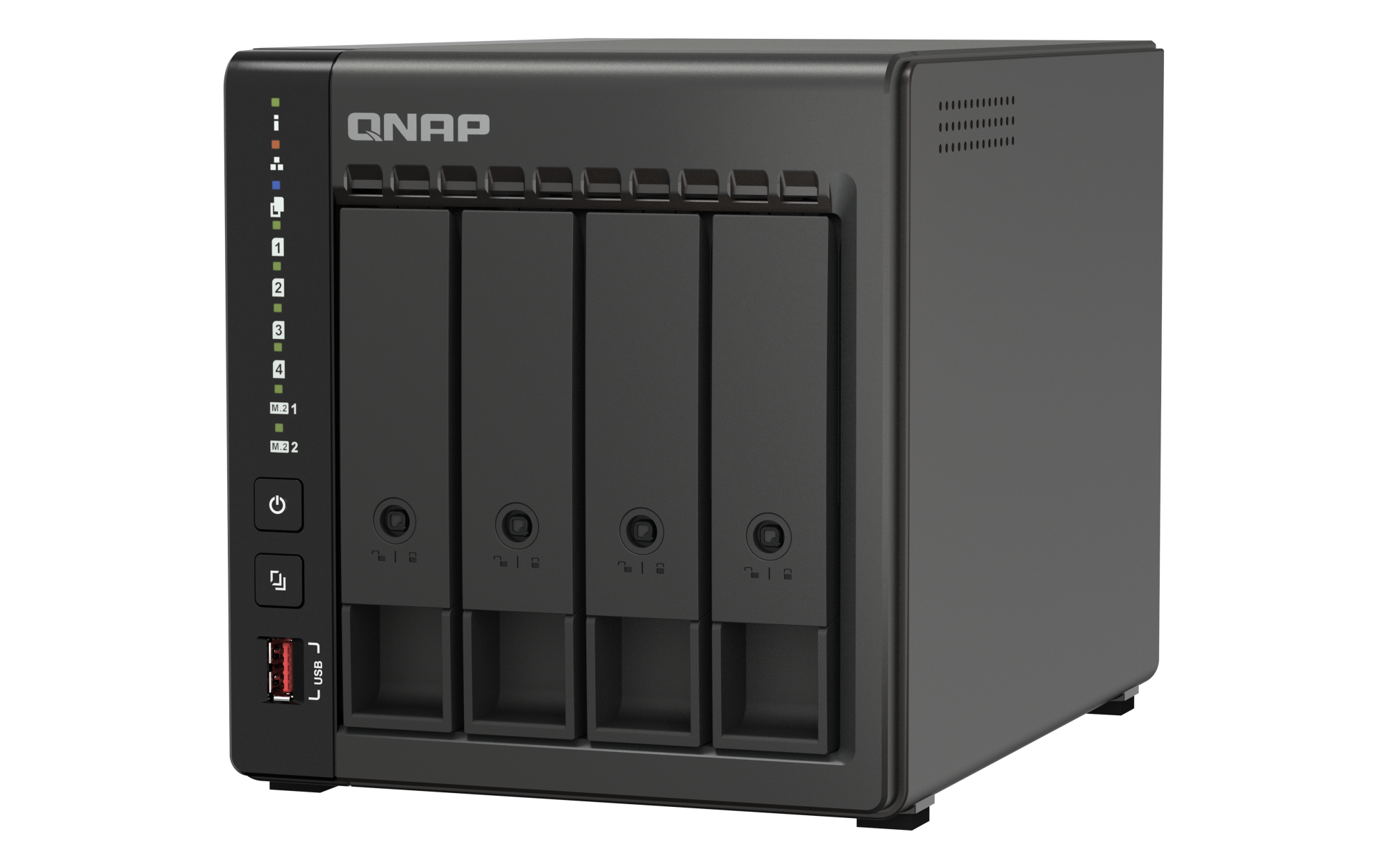 插槽 2: M.2 2280 NVMe PCIe Gen 3 x2兼容 PCIe Gen 3 以上的 NVMe SSD。请查询兼容性清单 https://www.qnap.com.cn/compatibility/。SSD 缓存加速支持 2.5 G以太网端口(2.5G/1G/100M) 2(2.5G/1G/100M/10M) 网络唤醒(WOL) 巨帧 USB 2.0 端口 1 USB 3.2 Gen 2 (10Gbps) 端口 2 x Type-A USB 3.2 Gen2 10Gbps HDMI™ 输出 1, HDMI™ 2.0 (up to 4096 x 2160 @ 60Hz) 外形规格 直立式 LED 指示灯 系统状态、局域网、USB、HDD1~4、M.2 1~2 按钮 电源,USB复制,系统重置 尺寸(高 x 宽 x 深) 170 × 162.56 × 220.98 mm 净重 2.09 kg 毛重 3.51 kg 工作温度 0 - 40°C (32°F - 104°F) 存储温度 -20 - 70 °C (-4°F - 158°F) 相对湿度 5-95% RH (不凝结),湿球:27˚C (80.6˚F) 电源单元 最小 84W 适配器,100-240V 功耗:典型工作模式 66.731 W NAS 装满硬盘的状态下所测试。风扇 1 x 120mm,12VDC 系统警告 蜂鸣器 Kensington 安全性插槽 较大并发连接数(CIFS)- 配备内存上限 1500 注意:请仅使用 QNAP 内存模块来保持系统的性能与稳定性。若 NAS 设备有多个内存模块,请使用规格相同的 QNAP 模块,并参考硬件用户手册安装兼容的 QNAP 内存模块。