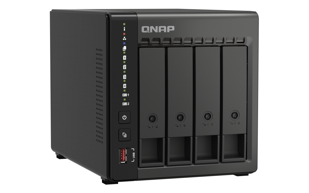插槽 2:M.2 2280 NVMe PCIe Gen 3 x2兼容 PCIe Gen 3 以上的 NVMe SSD。请查询兼容性清单 https://www.qnap.com.cn/compatibility/。SSD 快取加速支持 2.5 Gigabit 以太网络端口 (2.5G/1G/100M) 2 (2.5G/1G/100M/10M) 网络唤醒 (WOL) 巨型讯框 USB 2.0 端口 1 USB 3.2 Gen 2 (10Gbps) 端口 2 x Type-A USB 3.2 Gen 2 HDMI™ 输出 1,HDMI™ 2.0 (可高达 4096 x 2160 @ 60Hz) 外型 直立式 LED 指示灯 系统状态、网络、USB、HDD 1~4、M.2 1~2 按钮 电源、USB 复制、系统重置 尺寸 (高 x 宽 x 深) 170 × 162.56 × 220.98 mm 重量 (净重) 2.09 kg 重量 (总重) 3.51 kg 操作温度 0 - 40°C (32°F - 104°F) 存储温度 -20 - 70 °C (-4°F - 158°F) 相对湿度 5-95% RH (不凝结),湿球:27˚C (80.6˚F) 电源供应器 最小 84W 适配器,100-240V 耗电量:运作模式,一般 66.731 W NAS 装满硬盘的状态下所测试。风扇 1 x 120mm,12VDC 系统警示 蜂鸣器 Kensington 安全插槽 同时联机 (CIFS) 数目上限-内存上限 1500 注意:请仅使用 QNAP 内存模块来保持系统的性能与稳定性。若 NAS 设备有多个内存模块,请使用规格相同的 QNAP 模块,并参考硬件用户手册安装兼容的 QNAP 内存模块。