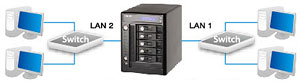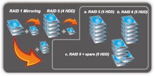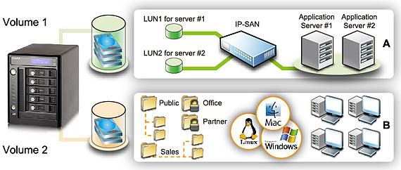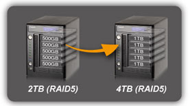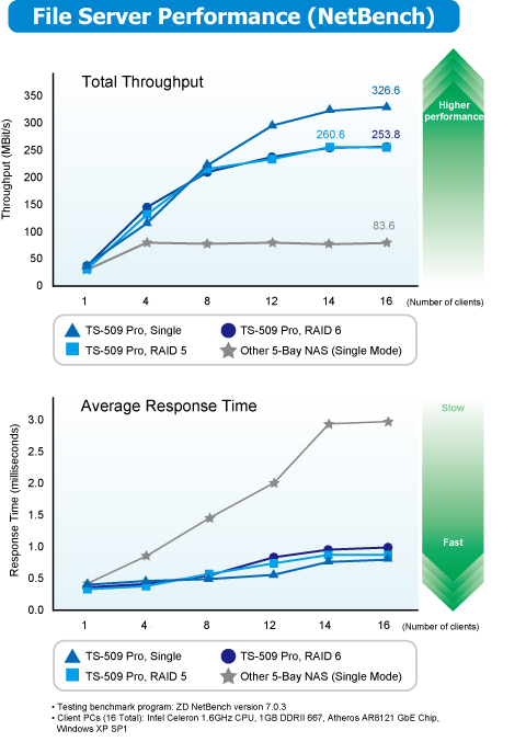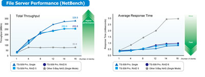 现今的商业环境需要一个集中化管理的数据中心,用以保护重要的数字信息、备份机密档案以及在工作群组或是部门间分享这些信息。拥有一个可靠、有效率、以及兼具弹性的数据备份系统将会是成功的重要关键。对IT管理人员来说,建置这样的系统也是一个日益重要的管理课题。QNAP TS-509 Pro Turbo NAS是针对中小企业的新一代多功能NAS服务器。具备超强的效能、丰富的服务器功能、业界更优异的 RAID 数据保护机制,以及稳定的硬盘热抽换设计等,TS-509 Pro为企业提供了低维护成本、方便的数据存取、分享,安全的大量数据存储中心,与加值的服务器功能全新感受。 搭载Intel Celeron 1.6GHz CPU, 1GB DDRII 内存, 支持5颗硬盘以及支持热抽换设计的 TS-509 Pro 在多样化应用的商业环境以及多人同时数据存取的环境下展现了特色的效能。TS-509 Pro的Linux 操作系统以及应用软件皆内建在高稳定性的 flash 微型硬盘记忆卡上。另外,系统支持双Gigabit LAN网络端口可以设定网络容错(failover)、负载平衡(load-balancing)或多网址设定同时服务两个子网段。 全新的V3用户接口 拥有可扩充及可升级的进阶RAID管理功能 为了确保数据的安全性,TS-509 Pro提供了先进的RAID磁盘阵列管理功能,只要透过简单页面设定即可轻松完成设定,其中包括RAID 0/ 1/ 5/ 6/ 5 + Spare,Single及JBOD。TS-509 Pro支持在线RAID容量扩充的功能,让使用者可以在初期建置系统时仅购买具有价格优势的硬盘,并且等到未来使用容量需求扩增时再行购买新的硬盘来作容量扩充。在线RAID组态迁移的功能,让使用者可以在初期少量购买硬盘,当未来希望升级RAID的备援等级时,也能够在不停机且保留数据的状态下做RAID等级的迁移。 低建置成本及高弹性的iSCSI解决方案 TS-509 Pro能够同时支持NAS及iSCSI装置,提供中小企业一个兼具低成本高弹性及有效率的IP-SAN解决方案。iSCSI装置支持高达8组,能够作为PC或服务器之存储空间的扩充,也可以当作服务器(如:数据库服务器、电子邮件服务器)之备份位置。针对iSCSI装置设定,TS-509 Pro更提供「存储资源随需分配」(Thin Provisioning)的功能。服务器管理员能够更有效率的在建置iSCSI装置的初期不受实体可存储空间的影响,预先做虚拟的配置。 AES 256-bit磁盘群组加密技术 针对极机密数据的高度保密的需求,TS-509 Pro支持AES 256-bit加密磁盘群组功能,使用者必须输入密钥密码才能开启扇区以存取服务器的数据,即使硬盘不慎遗失,亦可不用担心机密数据被窃取。 轻松设定,低维护成本 TS-509 Pro 前方的 LCD显示屏幕让使用者无需使用计算机,就可以快速、简便地做RAID组态的设定。使用者亦可藉由LCD显示屏幕来查阅系统的基本设定。电源开关机排程管理让IT管理人员可以弹性地依照上班时间来管理NAS服务器的开关机时间。智能型的网络唤醒 (Wake on LAN)功能也可以让服务器管理者在局域网络内方便地远程唤醒NAS。  针对商业使用而设计的高性能NAS 优异的效能表现 NetBench 是一个测量档案服务器处理档案读写效能的专业软件。测试的数据对于判断NAS装置或是档案服务器在多人同时存取的效能上具有指标性的意义。  测试结果显示 TS-509 Pro展现了特色的效能,其它品牌的NAS在全速效能下只有 TS-509 Pro 的一半或甚至是少于一半传输速度,这反映了TS-509 Pro在商业使用环境下表现出来的特色效能,是理想目标的服务器选择。 内建式微型硬盘记忆卡(DOM)搭载嵌入式防护的双操作系统 不同于一般NAS将操作系统安装于实体硬盘,TS-509 Pro所有的操作系统以及应用软件皆已事先嵌入了DOM。因此启动TS-509 Pro时,完全不需要读取实体的硬盘,而是读取内建的DOM,避免因为硬盘坏轨或是档案错误而造成的无法开机现象。嵌入在微型硬盘记忆卡的双操作系统,也会轮流执行开机程序,当其中一套操作系统失效时,另一套操作系统会自动递补上且完成开机动作,并且执行修复另一套操作系统的动作。双重保护之下,让系统处在较好的稳定状态。 支持热抽换设计 TS-509 Pro支持热抽换的设计,提供您不间断与容易维护的服务。名列前茅业界的 RAID 管理设计,相比于其它品牌的NAS,可以容许更多一颗的硬盘损毁,这样的设计可以带给使用者一个更安全的数据存储环境。 在线RAID容量扩充 RAID容量扩充让使用者可在保留所有数据、不停机的情况下,一步一步地顺利的进行RAID容量扩充。 |  | 在线RAID组态迁移 在线RAID组态迁移让使用者可透过简易步骤,在不停机且保留数据的状态下进行RAID等级迁移。 |  | 透过虚拟磁盘 ,弹性扩充您的 NAS 容量 经由独特的「外接虚拟磁盘」,管理者能更弹性地扩充 NAS 的容量。透过内建的iSCSI initiator功能来连接网络上其他 iSCSI target,可将其变成系统上的虚拟磁盘。QNAP NAS 可做为堆栈主装置 (stack master) ,连接多达 8 个虚拟磁盘/堆栈目标 (stack targets)。因此,所有的 NAS 使用者仅需联机至此单一入口,即可使用位于其它网络存储装置上的空间。  内建iSCSI装置服务 对中小企业而言,针对现在使用中的服务器能够拥有一个理想的高性能及存储空间扩充解决方案是必要的。然而,目前市面上大部分相关产品,不是不够有效率的应用(如:DAS, Direct Attached Storage)就是所费不赀及过于复杂(如:Fiber Channel SAN)。 TS-509 Pro能够同时支持NAS及iSCSI装置,是企业用户一个低建置成本且高弹性运用的IP-SAN(Storage Area Network)解决方案选择。服务器管理员能够