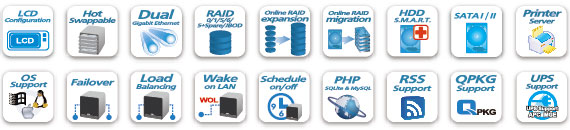 自动IP联机封锁机制 为防范NAS遭受到网络恶意入侵,服务器管理员能够建置允许、拒绝或是自动封锁透过SSH/ Telnet/ HTTP(S)/ FTP/ samba/ AFP的IP封锁机制,更加强化网络的安全防护。 轻松地作使用者账号以及数据夹管理 NAS支持批次建立使用者以及对应的使用者专用档案夹,对于服务器管理者来说,这是节省时间的一大福音。在安全的考虑下,服务器管理者可以在 Windows的网络环境作隐藏或是开启分享档案夹的设定。  | 档案服务器 管理者可在NAS建立使用者账号及密码,并定义使用者权限以及使用空间的容量。 |  | FTP服务器 您可以使用NAS建立自己专属的FTP服务器,设定服务器权限,并与其它使用者分享档案。 |  | 网页服务器 NAS内建phpMyAdmin、支援Joomla!、可编辑php.ini、MySQL及SQLite,使用者可以轻松地架设网页服务器或其它应用,如架设购物网站、论坛、部落格等。 |  | MySQL 服务器 NAS是您经济实惠的的数据库服务器的选择。它可以应用成为另一个在远程的网页服务器,也可以成为另一个额外的备份数据库。 |  | 打印机服务器 NAS支持网络打印机的功能(大量可支持三台USB打印机)。 | 安全监控中心 威连通的安全监控中心(Surveillance Station)直接授权可同时搭配4支网络摄影机(IP Camera),让使用者能够透过因特网设定及做远程管理,其中包含实时监控录像(real-time monitoring recording)、透过IE浏览器观看实时影像(Live View),播放(Playback)及事件记录(Log)等。另外,安全监控中心亦有贴心设计的进阶录像功能设定包含连续录像(Continuous recording)、位移侦测录像 (Motion-detection recording)及排程录像(Schedule recording)等,让使用者可以根据不同时段的需求,选择欲执行的模式,在达到安全监控需求的同时,亦能够兼顾NAS效能、节省硬盘存储空间及达到环保节能等多重效果。透过安全监控中心,所有的录像档案将以AVI档案格式存储,并支持时间戳(Time Stamp),使用者能容易地做档案搜寻且直接使用Windows Media Player播放。 支持最广泛网络摄影机品牌的网络安全监控方案 QNAP 网络磁碟机的安全监控中心支持市面上多款品牌的网络摄影机并通过实验室严格的兼容性与信赖性测试,包括了AXIS、D-Link、IPUX、LevelOne、Linksys、Panasonic 及Vivotek等。搭配特定型号的摄影机,使用者亦能够透过网页执行双向影音监控录像(Two-way video & audio),智能型PTZ操作(Pan, Tilt, Zoom)来控制监控的方位。 功能强大的系统管理工具 远程唤醒(Wake on LAN) 您可以透过远程遥控的方式唤醒在局域网络内的NAS。 智能型风扇 NAS内的风扇转速能够根据目前的系统温度自动调整,您亦可手动定义高转及低转的设定。 实时SMS/ Email警讯通知 您可以透过SMTP及SMSC的设定,立即接收实时Email及简讯通知,随时随地轻松掌握NAS的新一代状态。 支持SSL安全凭证 您可以上传经认可的安全凭证及X.509PEM格式的RSA私人金钥让使用者能够透过SSL登入来存取NAS的数据。 支持Syslog服务器设定 透过此设定,所有NAS的事件记录及联机纪录都能够被存储到远程Syslog服务器中。 网络资源回收筒 您可以设定将在NAS网络数据夹里删除的档案移到资源回收数据夹。透过这功能,您可以随时回复不小心删除的档案。 巨细靡遗的事件管理系统 NAS的所有联机记录,包括samba、FTP、AFP、HTTP、HTTPS、Telnet及SSH,以及透过网络服务登入系统的在线使用者联机信息等,让您能够容易管理并掌握所有的联机状况。 详尽的系统信息 您可以透过管理者页面掌握详尽的系统信息,例如:CPU使用率、所有内存及可使用的空间、发送接收及错误的封包数、系统开机、CPU温度、系统温度、硬盘温度及系统风扇的转速等。 透过QPKG平台扩充Turbo NAS新应用 QNAP新推出的QPKG 平台让使用者不用经由繁杂的程序,便能够透过简单的下载与安装,享受来自全球社群所开发的相关软件套件来扩充Turbo NAS的应用。  |