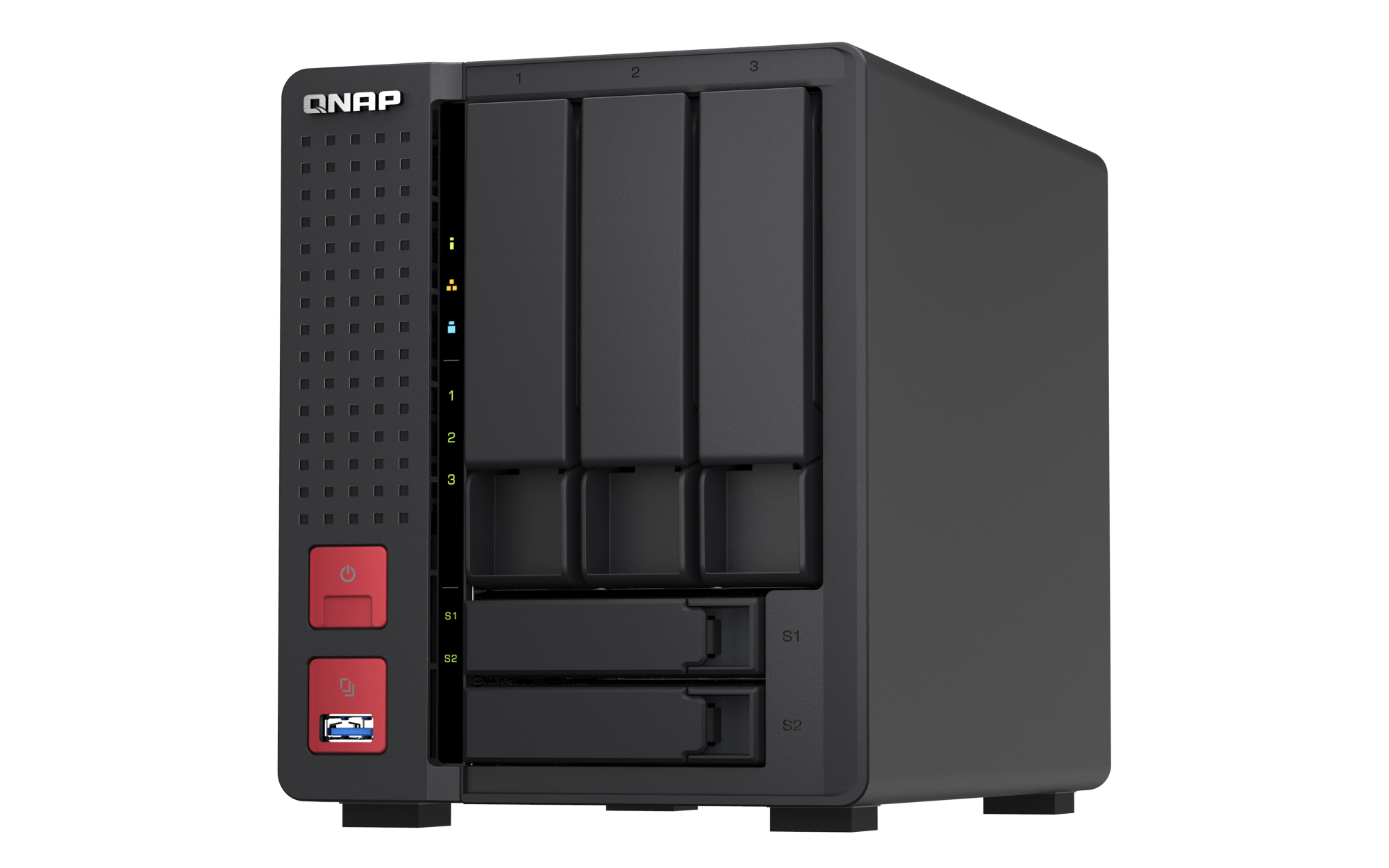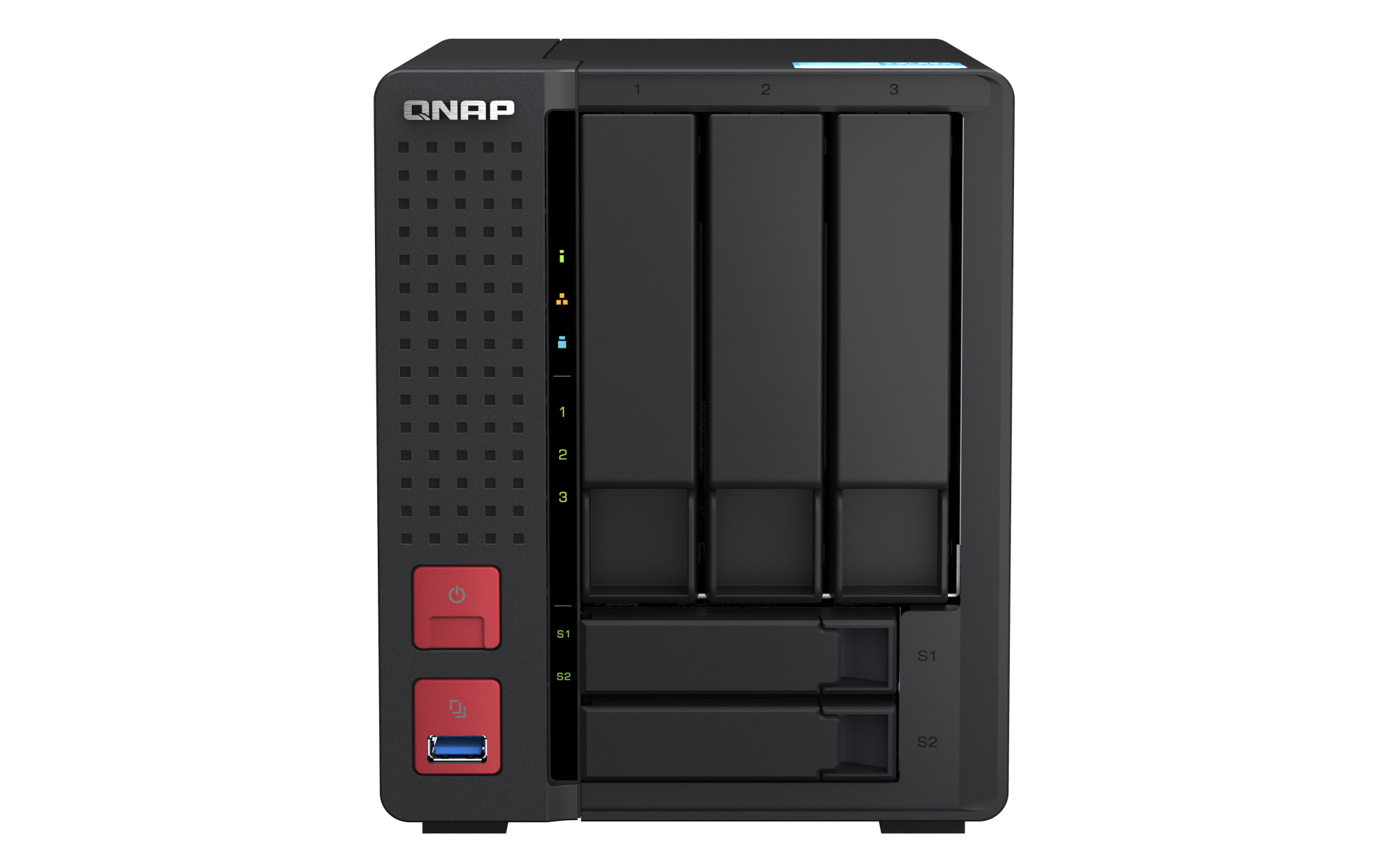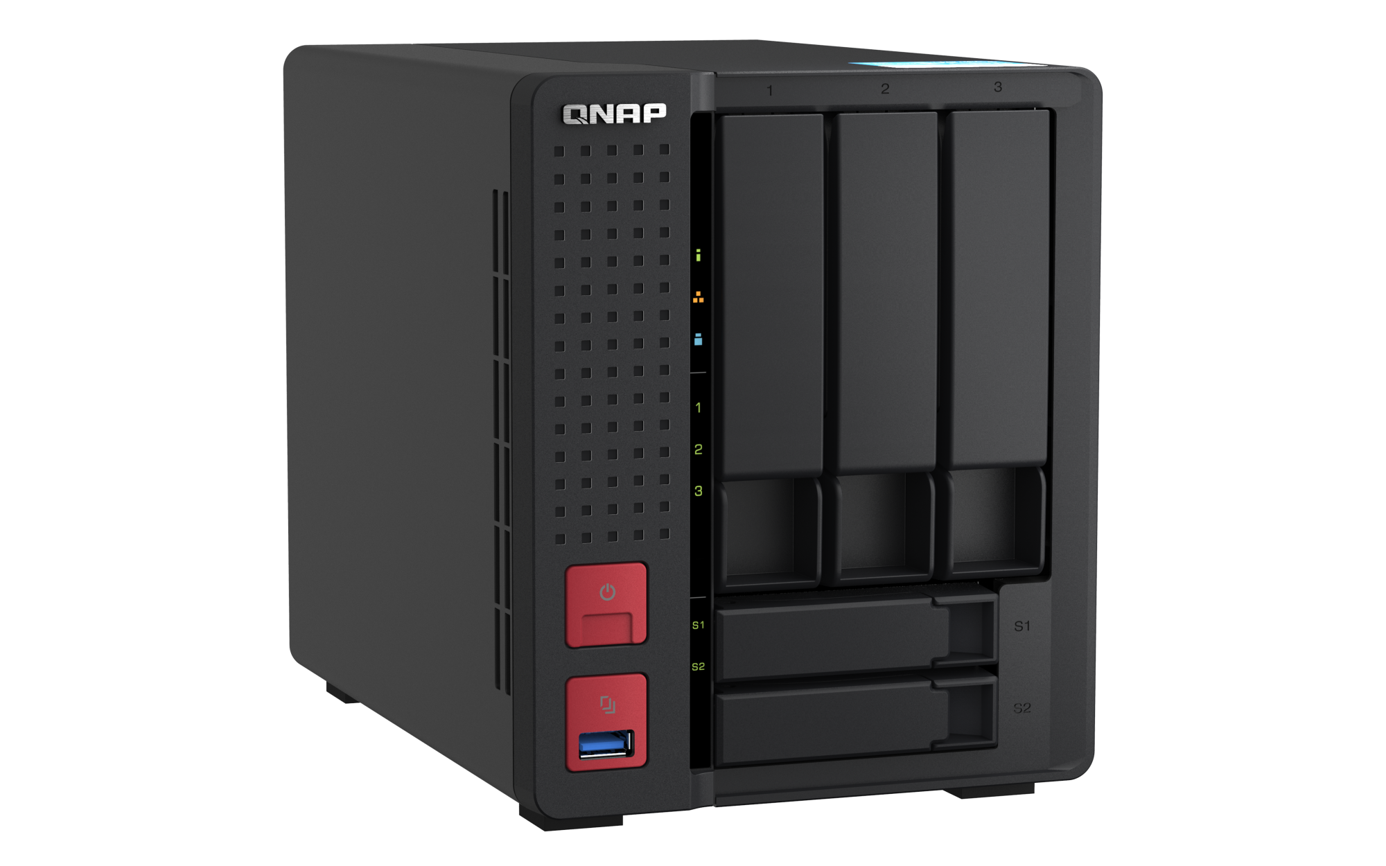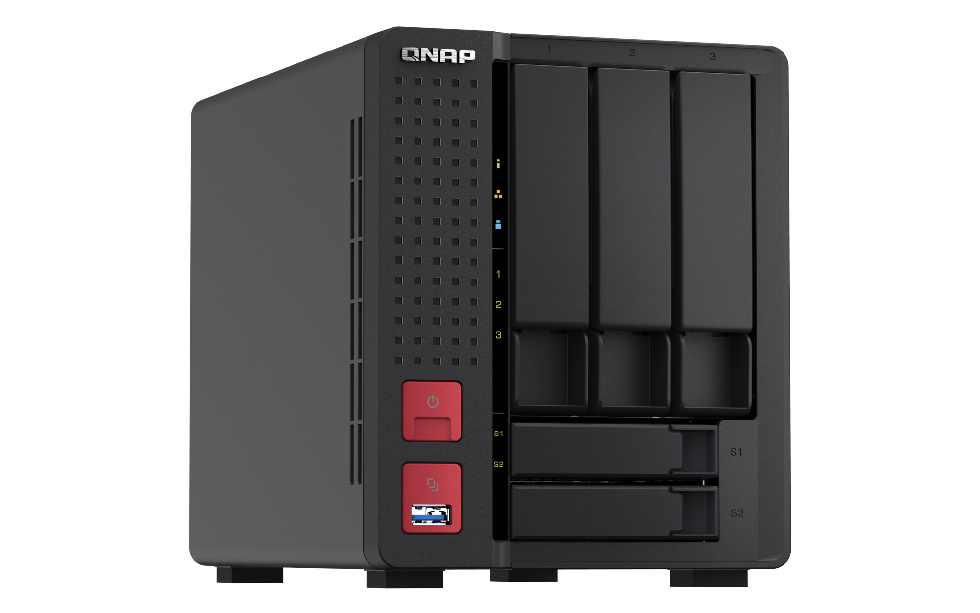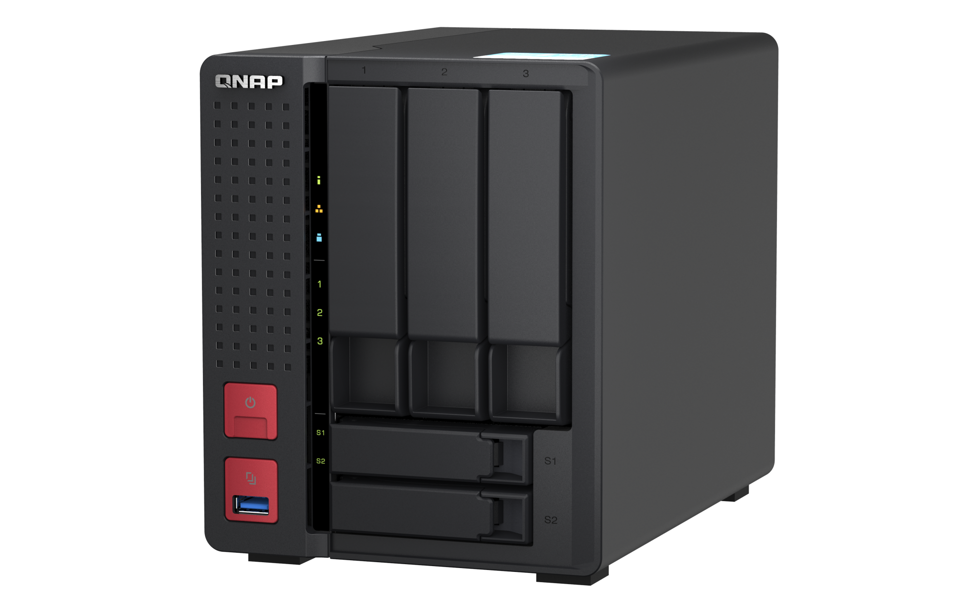 2.5 英寸 SATA 固态硬盘热插拔 SSD 缓存加速支持 2.5 G以太网端口(2.5G/1G/100M) 2(2.5G/1G/100M/10M) 网络唤醒(WOL) 巨帧 USB 2.0 端口 1 USB 3.2 Gen 1 端口 2 USB 3.2 Gen 2 (10Gbps) 端口 2 x Type-A USB 3.2 Gen2 10Gbps HDMI™ 输出 1,HDMI™ 4K 外形规格 直立式 LED 指示灯 系统状态、局域网、USB、HDD1~3、SSD1~2 按钮 电源,系统重置,USB复制 尺寸(高 x 宽 x 深) 182.88 × 147.32 × 220.98 mm 净重 2.6 kg 毛重 3.8 kg 工作温度 0 - 40°C (32°F - 104°F) 存储温度 -20 - 70 °C (-4°F - 158°F) 相对湿度 5-95% RH (不凝结),湿球:27˚C (80.6˚F) 电源单元 最小 84W 适配器,100-240V 风扇 1 x 92mm, 12VDC 系统警告 蜂鸣器 Kensington 安全性插槽 较大并发连接数(CIFS)- 配备内存上限 1500 注意:请仅使用 QNAP 内存模块来保持系统的性能与稳定性。若 NAS 设备有多个内存模块,请使用规格相同的 QNAP 模块,并参考硬件用户手册安装兼容的 QNAP 内存模块。