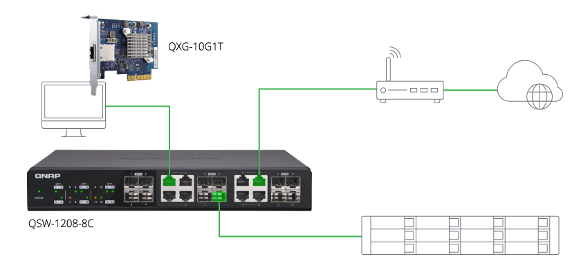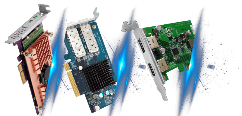 TS-832XU 提供一个 PCI Express (PCIe) 2.0 ×2 插槽 (×4 长度),可用于扩充 NAS 功能,例如安装额外的 10GBASE-T 网络端口及 M.2 SSD (SATA 或 PCIe NVMe*)。QNAP 提供一系列各式扩充卡,包括 QM2 扩充卡、单/双埠有线网卡及 USB 3.2 Gen 2 (10Gbps) 扩充卡,可让您充分运用 TS-832XU 的 PCIe 扩充能力,发挥 TS-832XU 的更多价值。