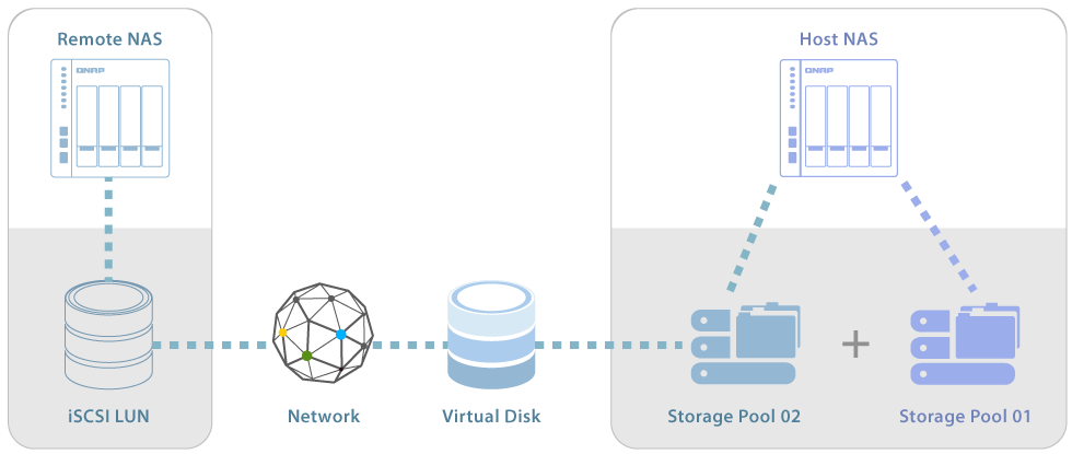 QNAP 的虚拟 JBOD 技术可用于扩充远程 NAS 容量,进而确保充分运用所有可用空间得到。