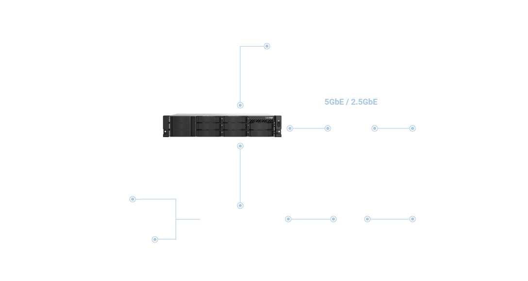 TS-855eU-RP 内置 2 个 2.5GbE RJ45 网络端口,您可沿用既有 CAT5e 网络线直接享有比 1G 速度快 2.5 倍的高速网络带宽,轻松将原有的网络布局与存储器验直接升级;为双端口 2.5GbE 设定 Port Trunking 网络聚合,可获得提升的传输性能与网络容错备援。搭配 QNAP 旗下多款网管型和非网管型 2.5GbE/10GbE 交换机,用精省预算打造流畅、安全、可扩充的高速网络环境。