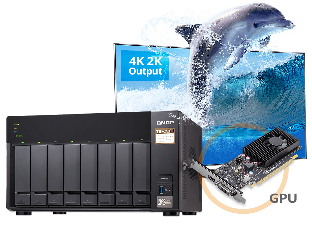 您可在 TS-873 上安装无须额外供电的图型显示适配器,来优化整体系统效能,而图型显示适配器的绘图效能更可带来流畅的影音编辑工作流,以及顺畅的 4K 高画质影像转文件播放效能,为您带来美好的多媒体视听体验。此外,您可额外购买 QNAP 遥控器 (RM-IR004),或在行动装置安装 Qremote 应用程序,轻松遥控您的娱乐体验。