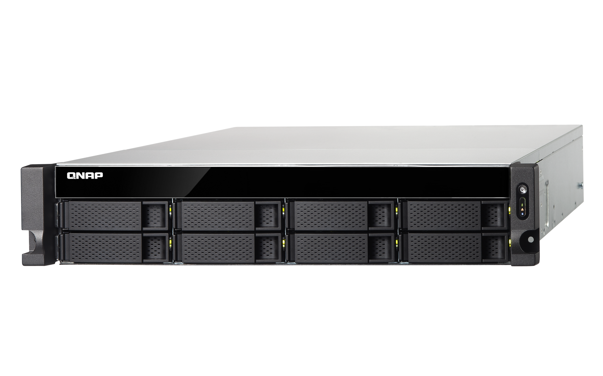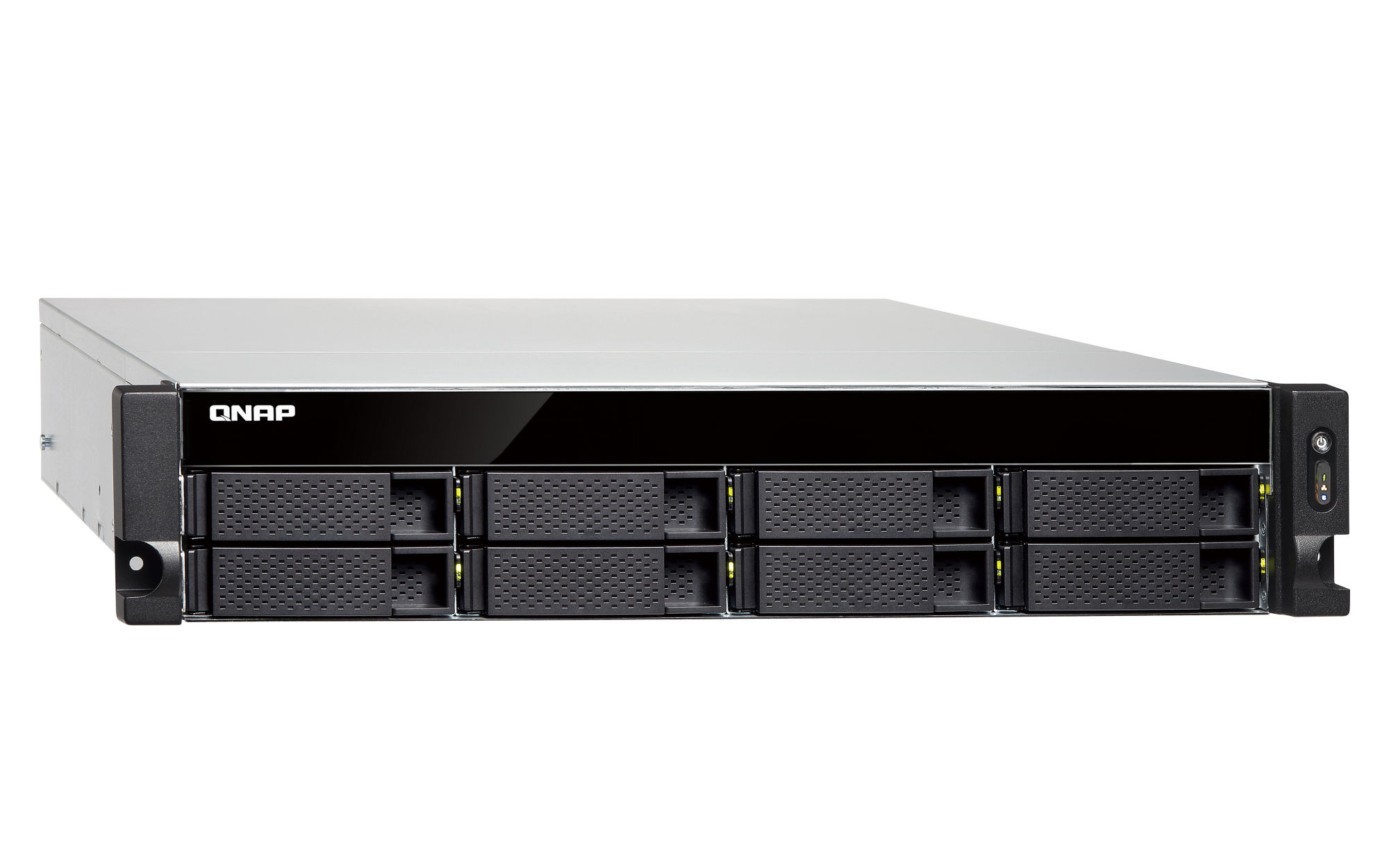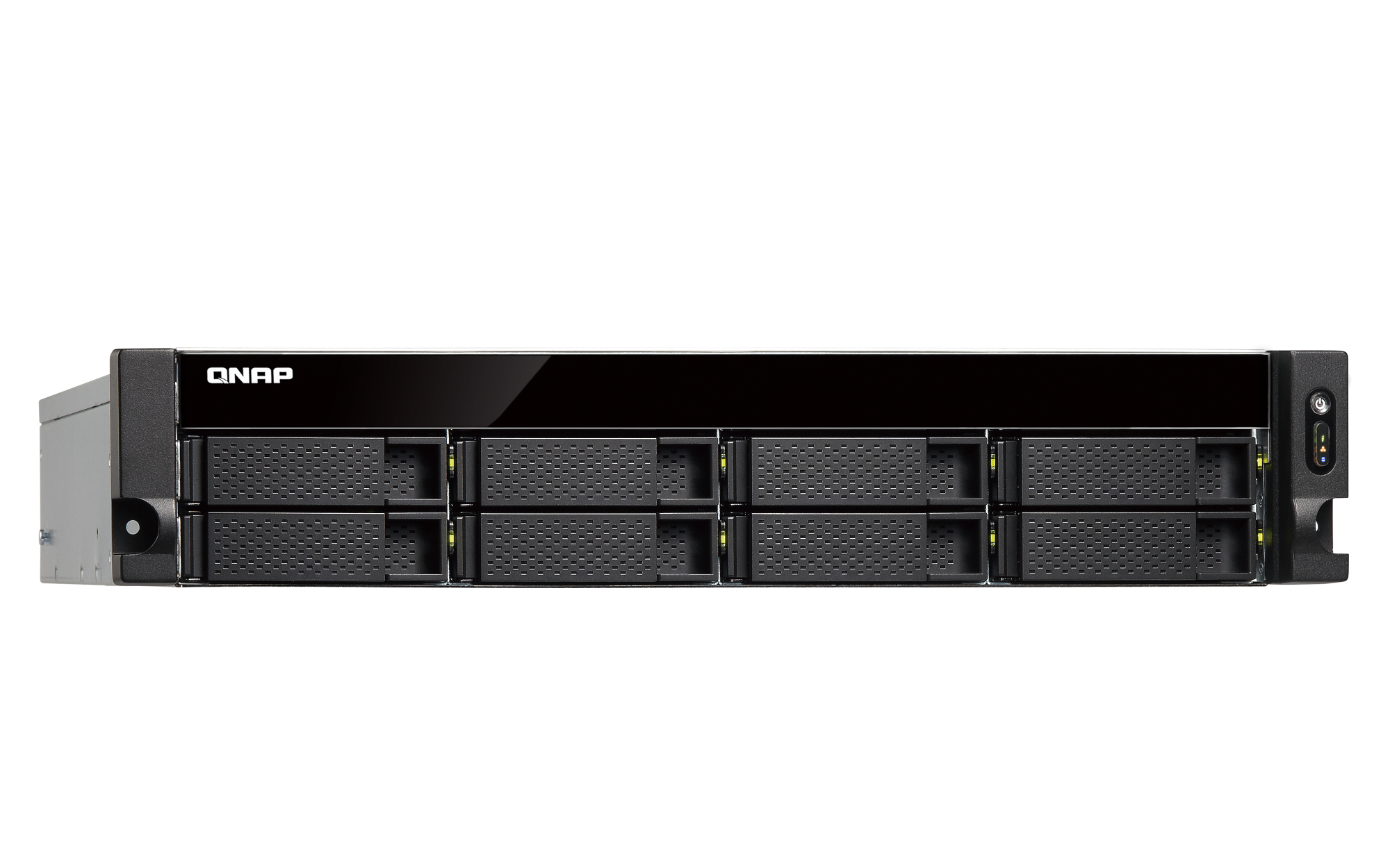 插槽 1: PCIe Gen 3 x4预装有一个 10GbE 适配器USB 2.0 端口 4 USB 3.2 Gen 1 端口 2 USB 3.2 Gen 2 (10Gbps) 端口 通过 PCIe 适配器可选 外形规格 2U 机架式 LED 指示灯 HDD 1-8,状态,局域网,USB,电源 按钮 电源、系统重置 尺寸(高 x 宽 x 深) 89 × 482 × 534 mm 净重 11.3 kg 工作温度 0 - 40°C (32°F - 104°F) 存储温度 -20 - 70 °C (-4°F - 158°F) 相对湿度 5-95% RH (不凝结),湿球:27˚C (80.6˚F) 电源单元 250W(x2)PSU,100 - 240V 功耗:磁盘待机模式 46.9 W 功耗:典型工作模式 107.65 W 使用满载 WD10EFRX 硬盘测试。风扇 2 x 70mm, 12 VDC 其他接口 1 x 3.5mm 控制台端口 系统警告 蜂鸣器 标准保修 3 较大并发连接数(CIFS)- 配备内存上限 1200 注意:请仅使用 QNAP 内存模块来保持系统的性能与稳定性。若 NAS 设备有多个内存模块,请使用规格相同的 QNAP 模块,并参考硬件用户手册安装兼容的 QNAP 内存模块。