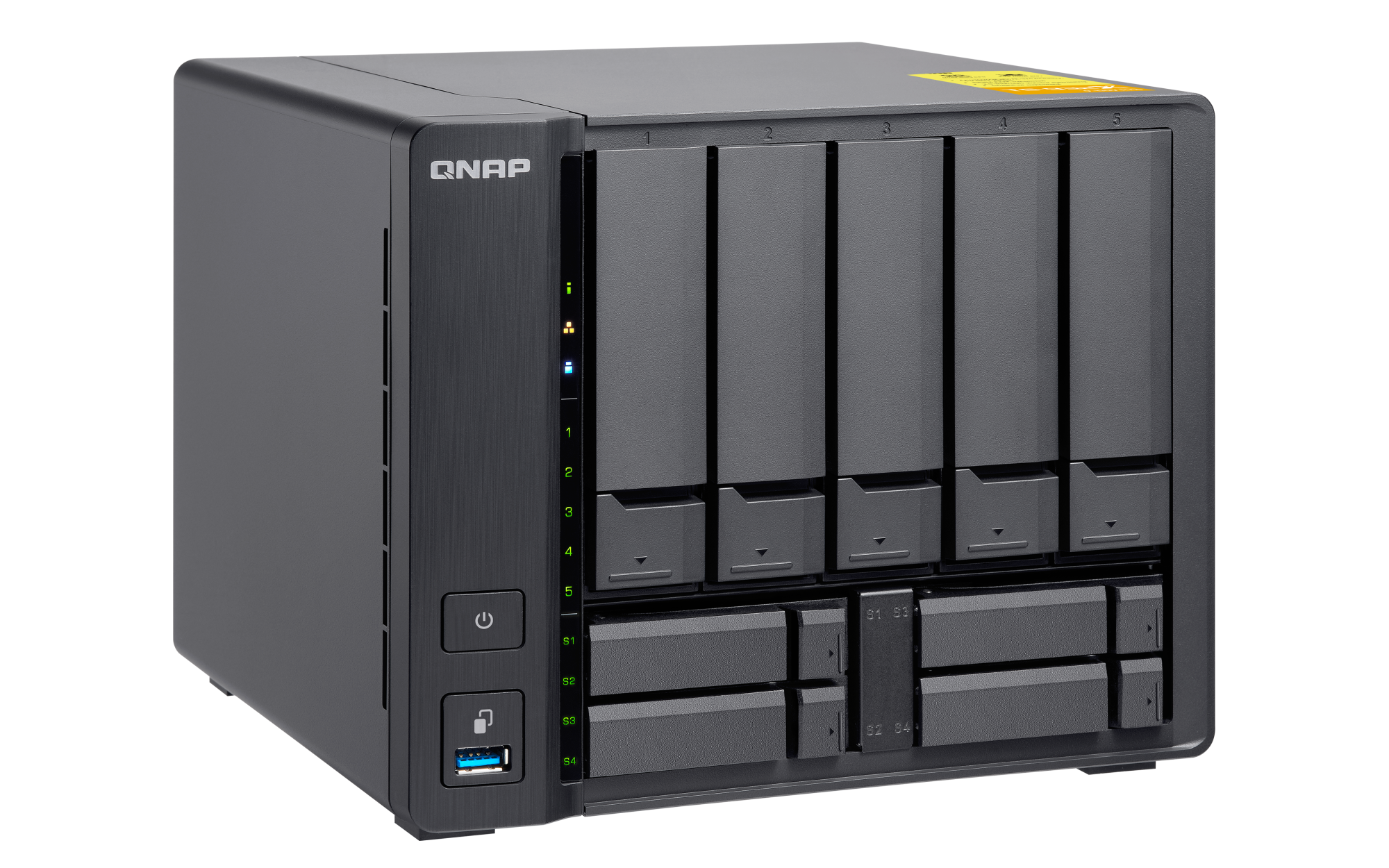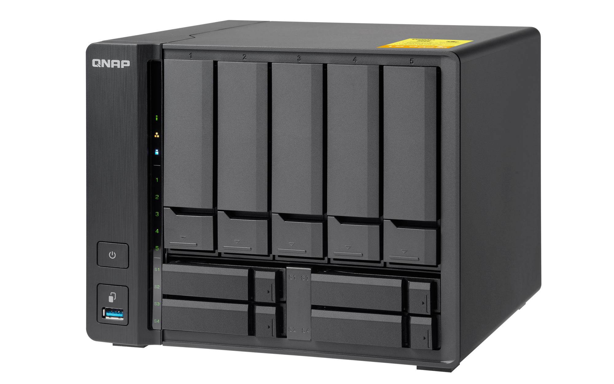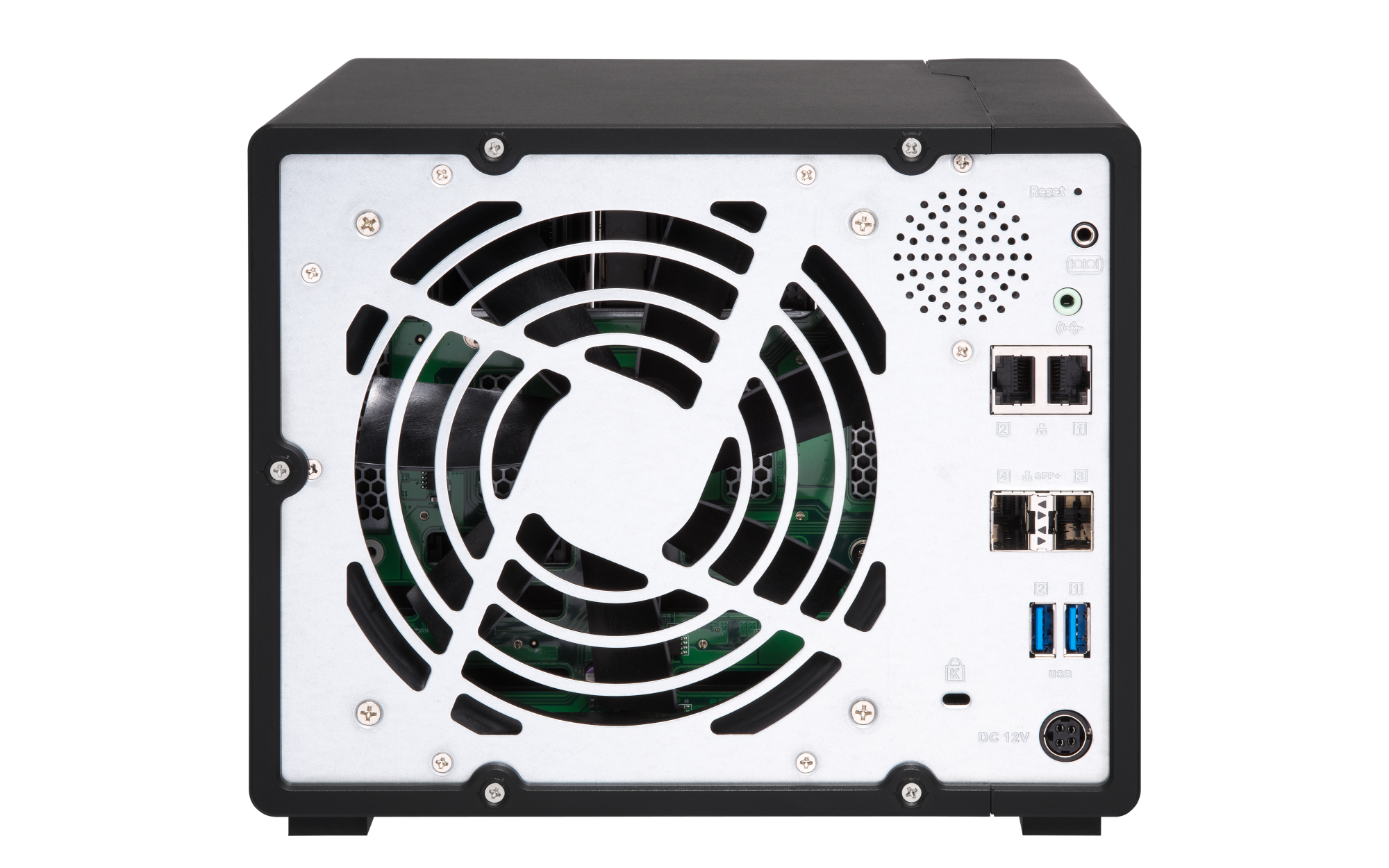 2.5 英寸固态硬盘热插拔 以太网端口(RJ45) 2 10 G以太网端口 2 x 10GbE SFP+ 网络唤醒(WOL) 巨帧 USB 3.2 Gen 1 端口 3 音频输出 1 x 内置扬声器,1 x 3.5mm 线路输出插孔(用于放大器或扬声器) 扬声器和线路输出插孔不能同时使用。外形规格 直立式 LED 指示灯 系统状态、局域网、USB、HDD1~5、SSD1-4 按钮 电源,系统重置,USB复制 尺寸(高 x 宽 x 深) 182.7 × 224.7 × 223.6 mm 净重 3.53 kg 毛重 5.06 kg 工作温度 0 - 40°C (32°F - 104°F) 存储温度 -20 - 70 °C (-4°F - 158°F) 相对湿度 5-95% RH (不凝结),湿球:27˚C (80.6˚F) 电源单元 外部,120W,AC 100 至 240V 功耗:磁盘待机模式 21.66 W 功耗:典型工作模式 42.15 W NAS 装满硬盘的状态下所测试。风扇 1 x 140mm,12VDC 系统警告 语音提示或蜂鸣器 Kensington 安全性插槽 标准保修 2 较大并发连接数(CIFS)- 配备内存上限 700 注意:请仅使用 QNAP 内存模块来保持系统的性能与稳定性。若 NAS 设备有多个内存模块,请使用规格相同的 QNAP 模块,并参考硬件用户手册安装兼容的 QNAP 内存模块。