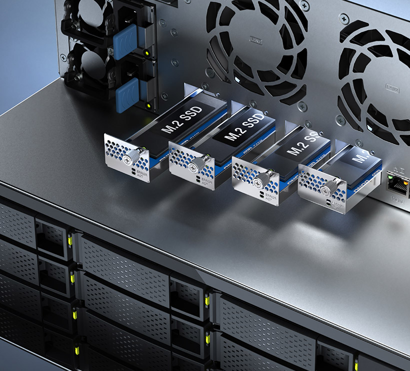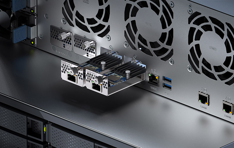 内置 4 个 E1.S/M.2 NVMe PCIe 插槽,可配置 SSD 快取或安装 QXG-ES10G1T E1.S 转 10GbE 网络模块,让 NAS 规格不受限。