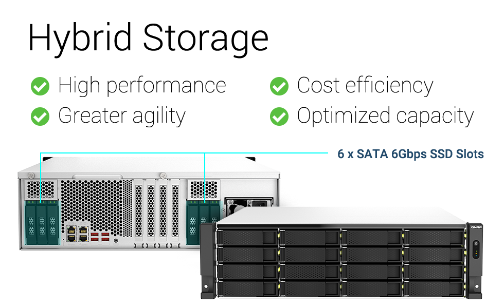 TS-h2287XU-RP 混合式的硬盘配置提供 16 个 3.5 英寸 SATA 6Gb/s 硬盘槽与 6 个 2.5 英寸 SATA 6Gb/s SSD 专用端口,您可配两块以上 SSD 设置 RAID 组态,其余 SSD 再弹性配置快取,大幅提升 IOPS 性能以满足密集存取应用需求,与传统 HDD 数组相比,性能迅速提升。
