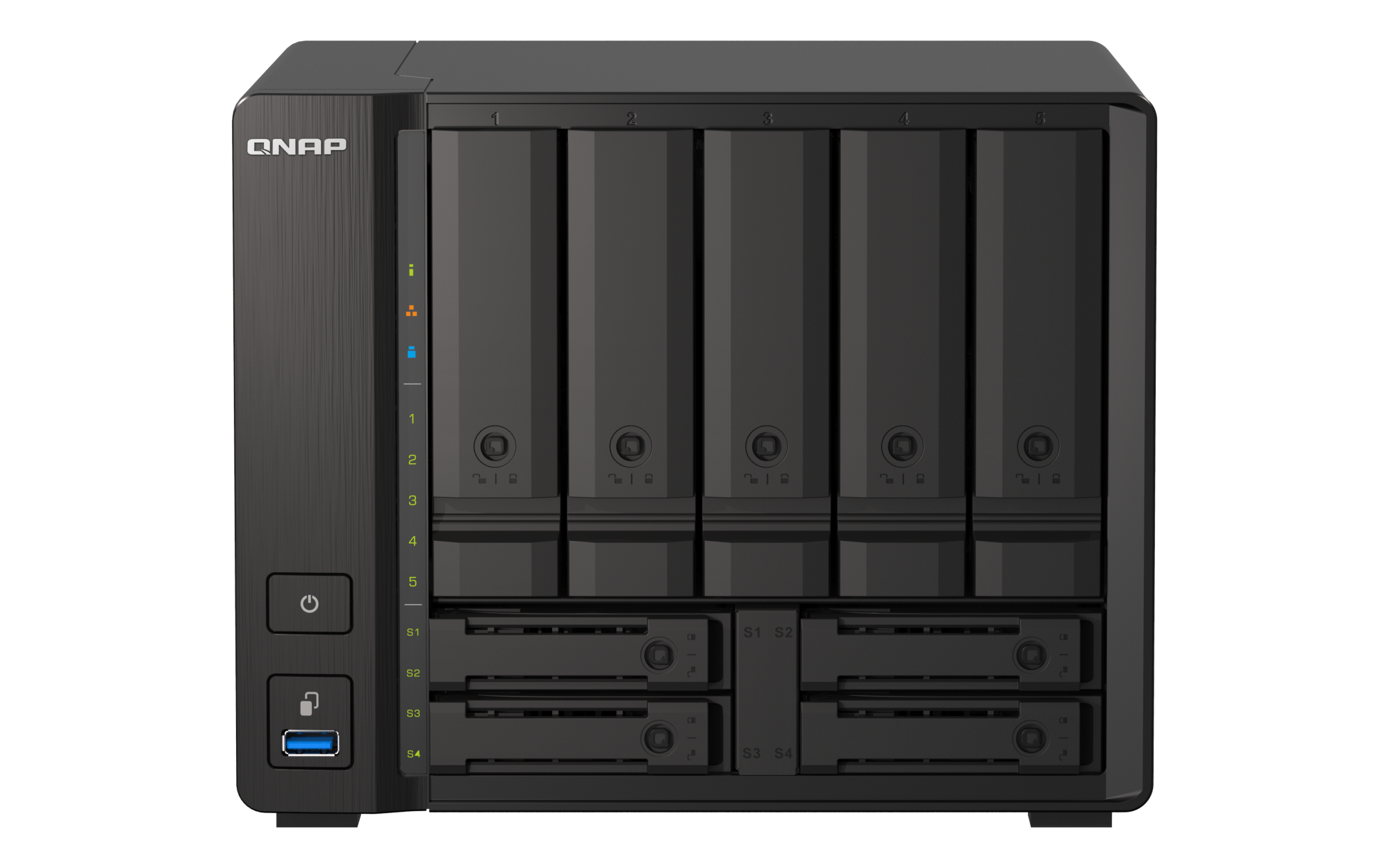 3 x Type-A USB 3.2 Gen 2外形规格 直立式 LED 指示灯 HDD 1-5、SSD 1-4、电源 / 状态、局域网、USB 按钮 电源,系统重置,USB复制 尺寸(高 x 宽 x 深) 176.5 × 224.6 × 224.1 mm 尺寸不包括脚垫(根据型号,脚垫高度可达 30mm/1.18 英寸)净重 4.34 kg 毛重 5.08 kg 工作温度 0 - 40°C (32°F - 104°F) 存储温度 -20 - 70 °C (-4°F - 158°F) 相对湿度 5-95% RH (不凝结),湿球:27˚C (80.6˚F) 电源单元 外部,120W,AC 100 至 240V 功耗:磁盘待机模式 41.2 W 功耗:典型工作模式 55.41 W NAS 装满硬盘的状态下所测试。风扇 1 x 140mm,12VDC 系统警告 蜂鸣器 Kensington 安全性插槽 标准保修 3 较大并发连接数(CIFS)- 配备内存上限 2000 注意:请仅使用 QNAP 内存模块来保持系统的性能与稳定性。若 NAS 设备有多个内存模块,请使用规格相同的 QNAP 模块,并参考硬件用户手册安装兼容的 QNAP 内存模块。