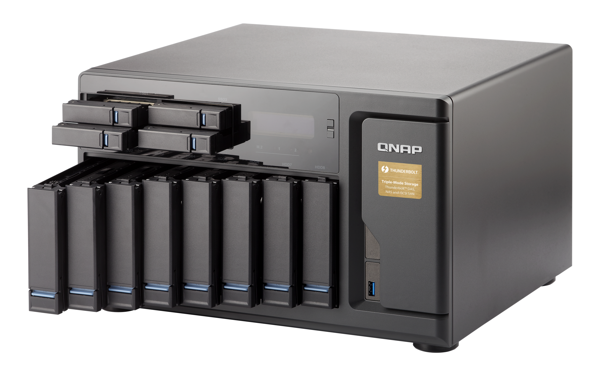 M.2 SSD 操作可能会产生过多热量。建议在 M.2 SSD 上安装散热片(来自 QNAP 或第三方提供)。SSD 缓存加速支持 SSD 插槽 1、2、3、4 GPU 直通 以太网端口(RJ45) 4 10 G以太网端口 2 x 10GBASE-T 网络唤醒(WOL) 巨帧 Thunderbolt 端口 2 x Thunderbolt ™ 2 高速端口 仅支持 Thunderbolt 连接用于Windows和Mac主机及USB存储设备。不支持第三方 Thunderbolt 外部存储设备。PCIe 插槽 3