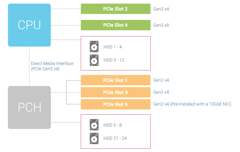 TVS-2472XU-RP 提供多个 PCIe 扩展槽,具备高度扩充性。为确保 SATA 硬盘有充裕的带宽确保其提供出色效能表现,由平台路径控制器 (PCH) 引出的 PCIe Gen2 插槽 (Slot 1, 3, 5) 建议使用低速接口的扩充卡,例如:1GbE 网卡、USB 3.2 Gen 1 扩充卡、或无线网络扩充卡等等;而由 CPU 引出的 PCIe Gen3 插槽 (Slot 2, 4) 则可使用高速接口的扩充卡展现出色效能,例如:10GbE/40GbE 网卡、SAS 扩充卡、Mustang-200 运算加速卡、或者 GPU 图形显示适配器。