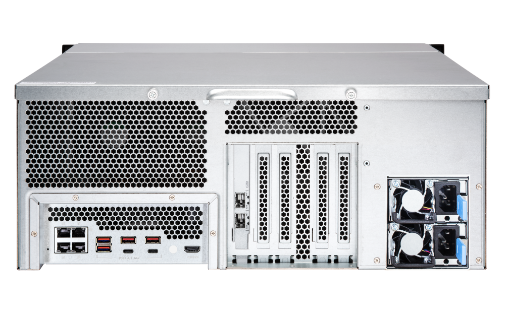 4 x Type-A USB 3.2 Gen 2 10GbpsHDMI™ 输出 1,HDMI™ 2.0 (可高达 3840 x 2160 @ 60Hz) 外型 4U 机架式 LED 指示灯 HDD 1-24、状态、网络、存储空间扩充端口状态 按钮 电源、系统重置 尺寸 (高 x 宽 x 深) 176.15 × 481.04 × 672.02 mm 重量 (净重) 20.67 kg 重量 (总重) 28.56 kg 操作温度 0 - 40°C (32°F - 104°F) 存储温度 -20 - 70 °C (-4°F - 158°F) 相对湿度 5-95% RH (不凝结),湿球:27˚C (80.6˚F) 电源供应器 800W (x2),100-240V 耗电量:运作模式,一般 171.29 W 通过 WD10EFRX 硬盘满载测试。风扇 系统风扇:4 x 92mm,12VDC 系统警示 蜂鸣器 标准保固 3 同时联机 (CIFS) 数目上限-内存上限 3500 注意:请仅使用 QNAP 内存模块来保持系统的性能与稳定性。若 NAS 设备有多个内存模块,请使用规格相同的 QNAP 模块,并参考硬件用户手册安装兼容的 QNAP 内存模块。