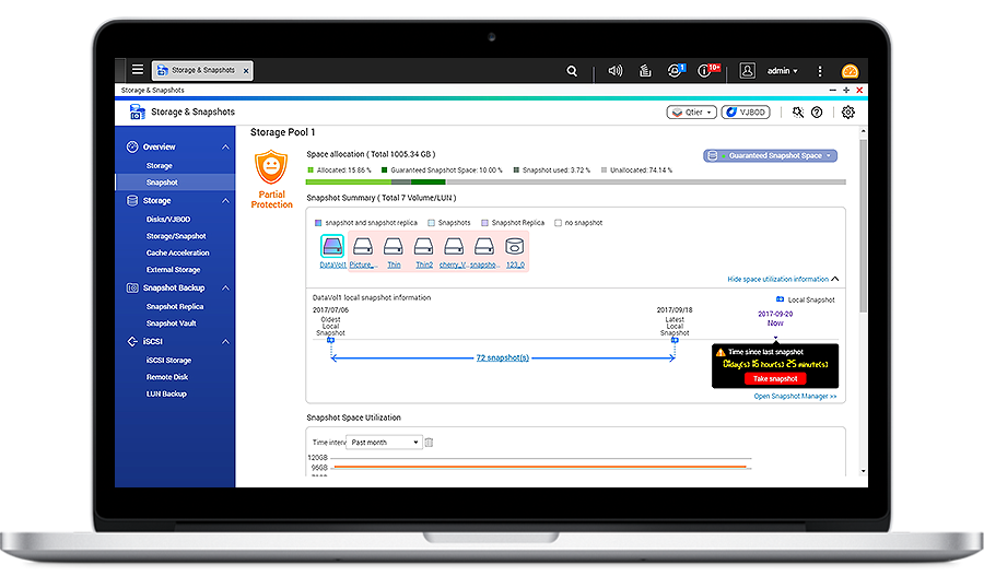 快照 (Snapshot) 可完整记录 TVS-672N 的系统状态及数据,是保护您数据的重要利器,更能有效对抗勒索软件的威胁。您可由 QTS Storage & Snapshots (存储与快照总管) 或直接从 File Station 中开启快照管理员来进行数据快照与还原,当档案毁损发生,可透过快照让系统迅速回复正常状。QNAP 区块层级 (Block-based) 快照每次仅存储变动的数据,不但节省空间,备份及还原时间更大幅缩短。TVS-672N 可支持整机多达 1,024 个快照版本数量;单一 Volume/LUN 数量上限 256 个版本。