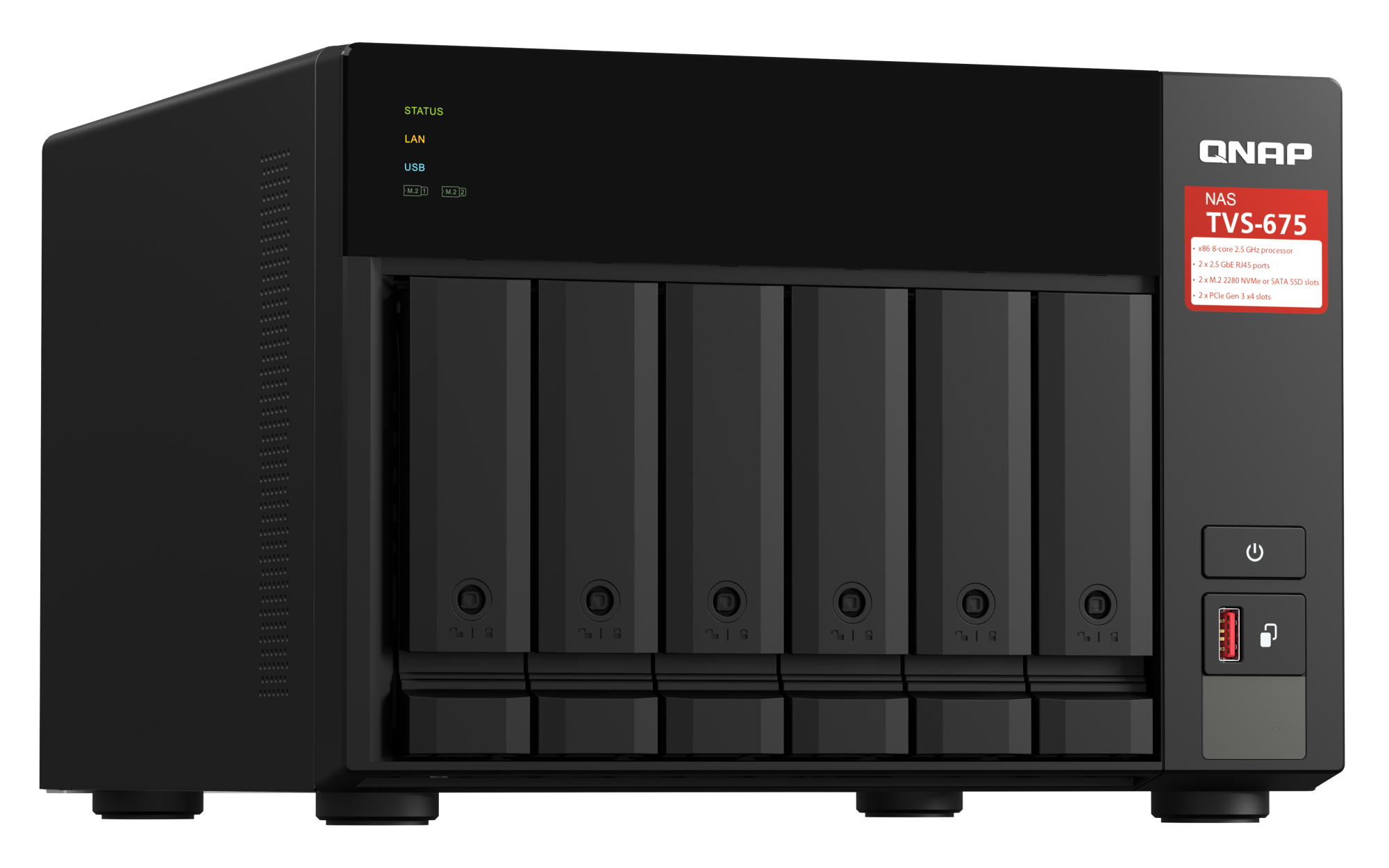 如不使用下一个 PCIe 插槽,可安装更宽的卡。USB 3.2 Gen 1 端口 2 USB 3.2 Gen 2 (10Gbps) 端口 2 x Type A HDMI™ 输出 1, HDMI™ 2.0 (up to 3840 x 2160 @ 60Hz) 外形规格 直立式 LED 指示灯 HDD 1-6、状态、局域网、USB、M.2 SSD 1-2 按钮 电源,系统重置,USB复制 尺寸(高 x 宽 x 深) 180.2 × 264.3 × 279.6 mm 尺寸不包括脚垫(根据型号,脚垫高度可达 30mm/1.18 英寸)净重 7 kg 毛重 7.8 kg 工作温度 0 - 40°C (32°F - 104°F) 存储温度 -20 - 70 °C (-4°F - 158°F) 相对湿度 5-95% RH (不凝结),湿球:27˚C (80.6˚F) 电源单元 250W,100-240V AC,50/60Hz,3.5A 功耗:磁盘待机模式 41.897 W 功耗:典型工作模式 60.794 W 风扇 3 x 80mm,12VDC 系统警告 蜂鸣器 Kensington 安全性插槽 标准保修 3 较大并发连接数(CIFS)- 配备内存上限 2000 注意:请仅使用 QNAP 内存模块来保持系统的性能与稳定性。若 NAS 设备有多个内存模块,请使用规格相同的 QNAP 模块,并参考硬件用户手册安装兼容的 QNAP 内存模块。