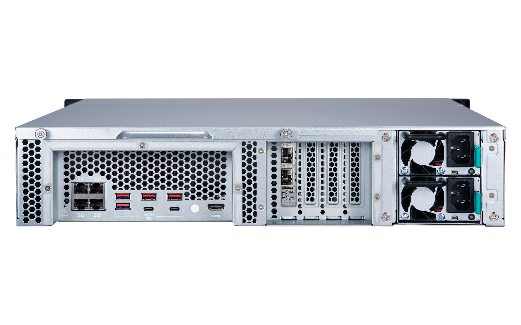 4 x Type-A USB 3.2 Gen 2 10GbpsHDMI™ 输出 1, HDMI™ 2.0 (up to 3840 x 2160 @ 60Hz) 外形规格 2U 机架式 LED 指示灯 HDD 1-8、状态、局域网、存储扩展端口状态 按钮 电源、系统重置 尺寸(高 x 宽 x 深) 88.3 × 482 × 562 mm 净重 11.89 kg 毛重 15.49 kg 工作温度 0 - 40°C (32°F - 104°F) 存储温度 -20 - 70 °C (-4°F - 158°F) 相对湿度 5-95% RH (不凝结),湿球:27˚C (80.6˚F) 电源单元 300W (x2), 100 - 240V 功耗:典型工作模式 90.02 W 使用满载 WD10EFRX 硬盘测试。风扇 系统风扇:2 x 60mm,12VDC 系统警告 蜂鸣器 标准保修 3 较大并发连接数(CIFS)- 配备内存上限 2500 注意:请仅使用 QNAP 内存模块来保持系统的性能与稳定性。若 NAS 设备有多个内存模块,请使用规格相同的 QNAP 模块,并参考硬件用户手册安装兼容的 QNAP 内存模块。