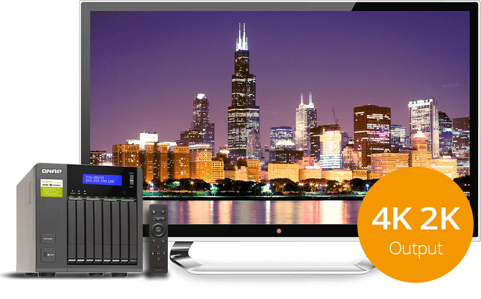 TVS-882ST2 提供 1 个 HDMI 输出埠,可连接 HDTV 或 A/V 扩大机,搭配 HybridDesk Station (HD Station) 内建的媒体播放器直接欣赏 TVS-882ST2 里的丰富影音档案,享受画质清晰的 4K 影片。HD Station 支持使用者登入机制,确保仅有被授权的使用者才可通过 HDMI 外接屏幕存取 TVS-882ST2 上的数据。HD Station 支持同时开启多个应用程序、多国键盘及输入法,使用上就像个人计算机一样。TVS-882ST2 包装附赠 QNAP遥控器 可轻松操作 HD Station。您的行动装置也可安装 Qremote 应用程序,成为遥控器,轻松遥控娱乐体验,藉由 QButton 功能,更能让您随心设定按键功能,播放 NAS 歌曲列表、监看摄影机频道或是重启关闭 NAS变得更简单,让您享受便利的 NAS 数位生活体验。