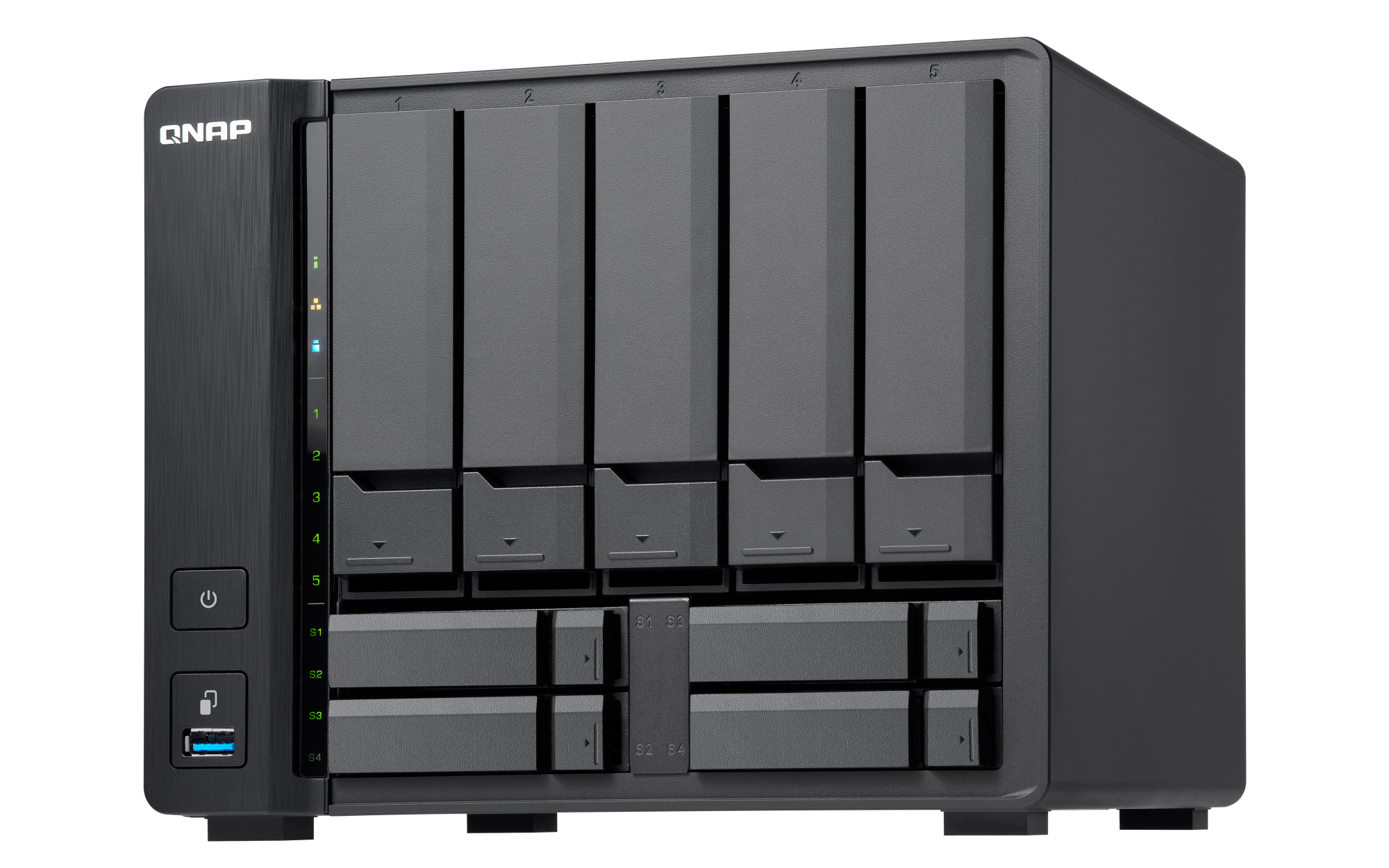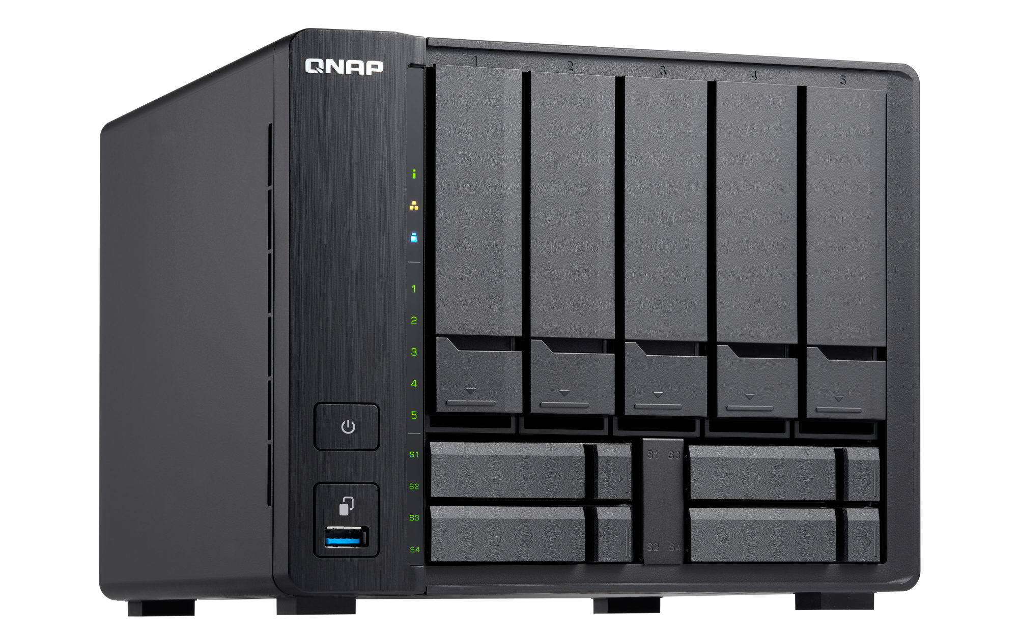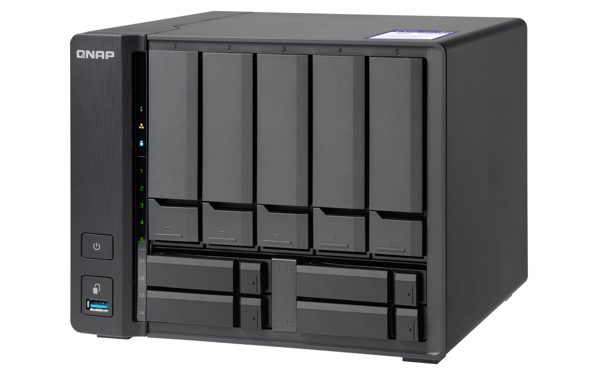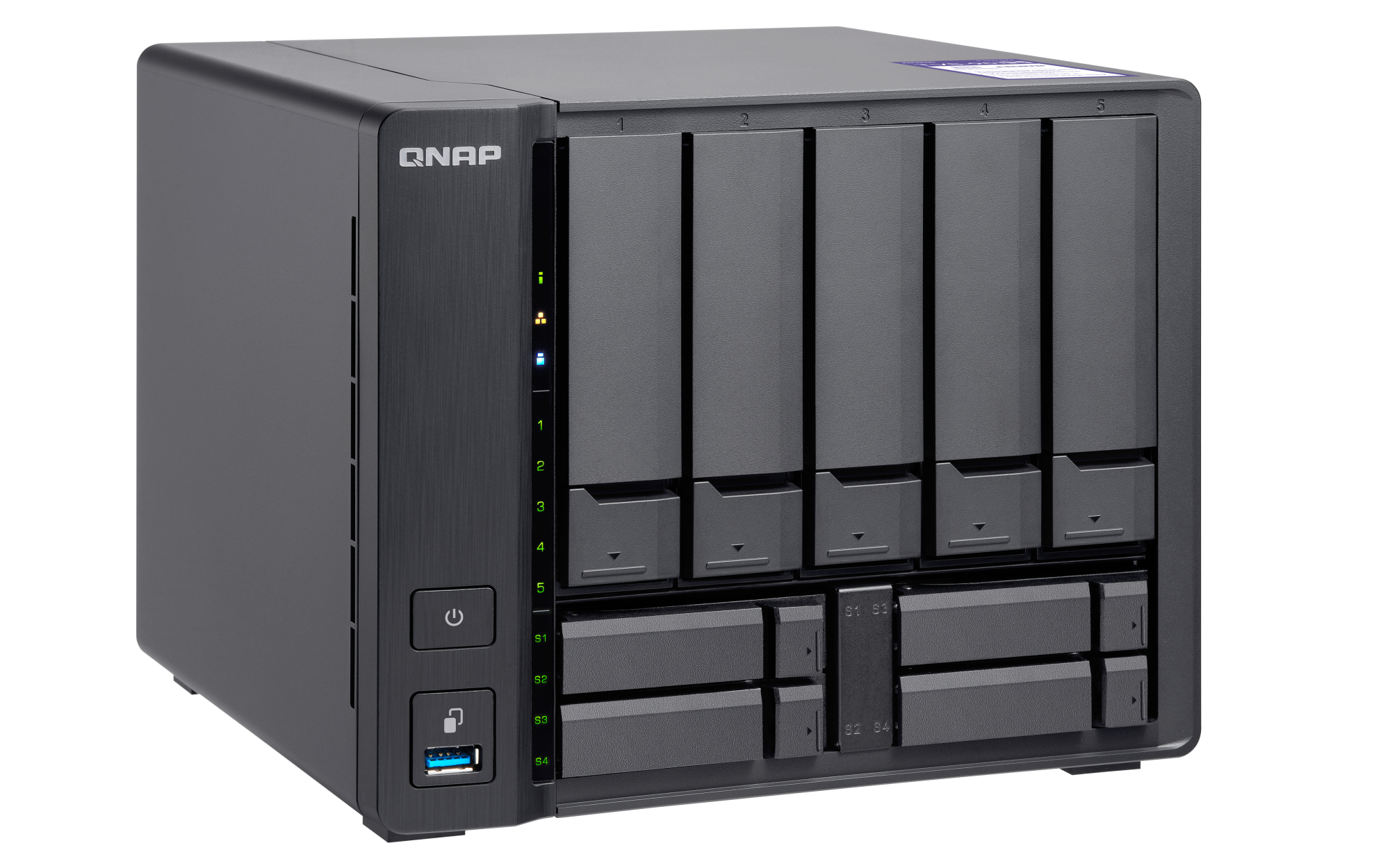 2.5 英寸 SATA 固态驱动器热插拔 SSD 缓存加速支持 以太网端口(RJ45) 1 5 G以太网端口(5G/2.5G/1G/100M) 1 x 5GBASE-T(5G/2.5G/1G/100M) 网络唤醒(WOL) 巨帧 USB 3.2 Gen 1 端口 4 红外传感器 (选配 QNAP RM-IR004 遥控器) HDMI™ 输出 1, HDMI™ 1.4b (up to 4096 x 2304 @ 24Hz) 音频输出 1 x 扬声器,1 x 线路输出 外形规格 直立式 LED 指示灯 电源 / 状态,局域网,USB,HDD1-5,SSD1-4 按钮 电源,一键复制,系统重置 尺寸(高 x 宽 x 深) 182.7 × 224.7 × 223.6 mm 净重 3.53 kg 工作温度 0 - 40°C (32°F - 104°F) 存储温度 -20 - 70 °C (-4°F - 158°F) 相对湿度 5-95% RH (不凝结),湿球:27˚C (80.6˚F) 电源单元 120W 100-240V AC 适配器 功耗:典型工作模式 39.366 W NAS 装满硬盘的状态下所测试。风扇 系统风扇:1 x 140mm, 12VDC 系统警告 蜂鸣器 Kensington 安全性插槽 较大并发连接数(CIFS)- 配备内存上限 1500 注意:请仅使用 QNAP 内存模块来保持系统的性能与稳定性。若 NAS 设备有多个内存模块,请使用规格相同的 QNAP 模块,并参考硬件用户手册安装兼容的 QNAP 内存模块。