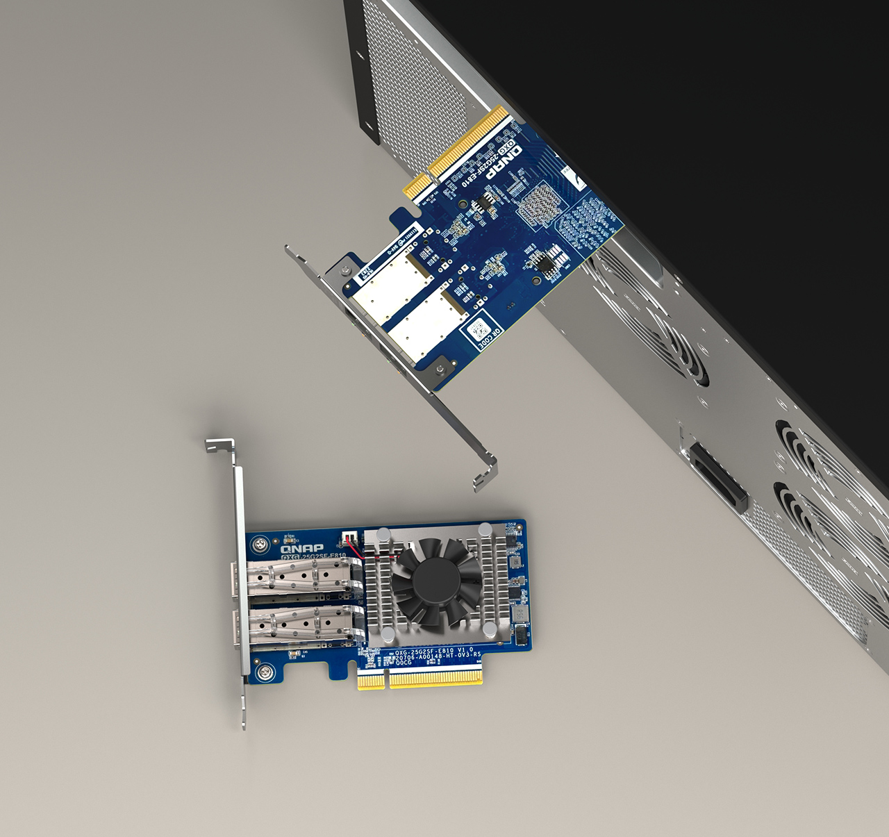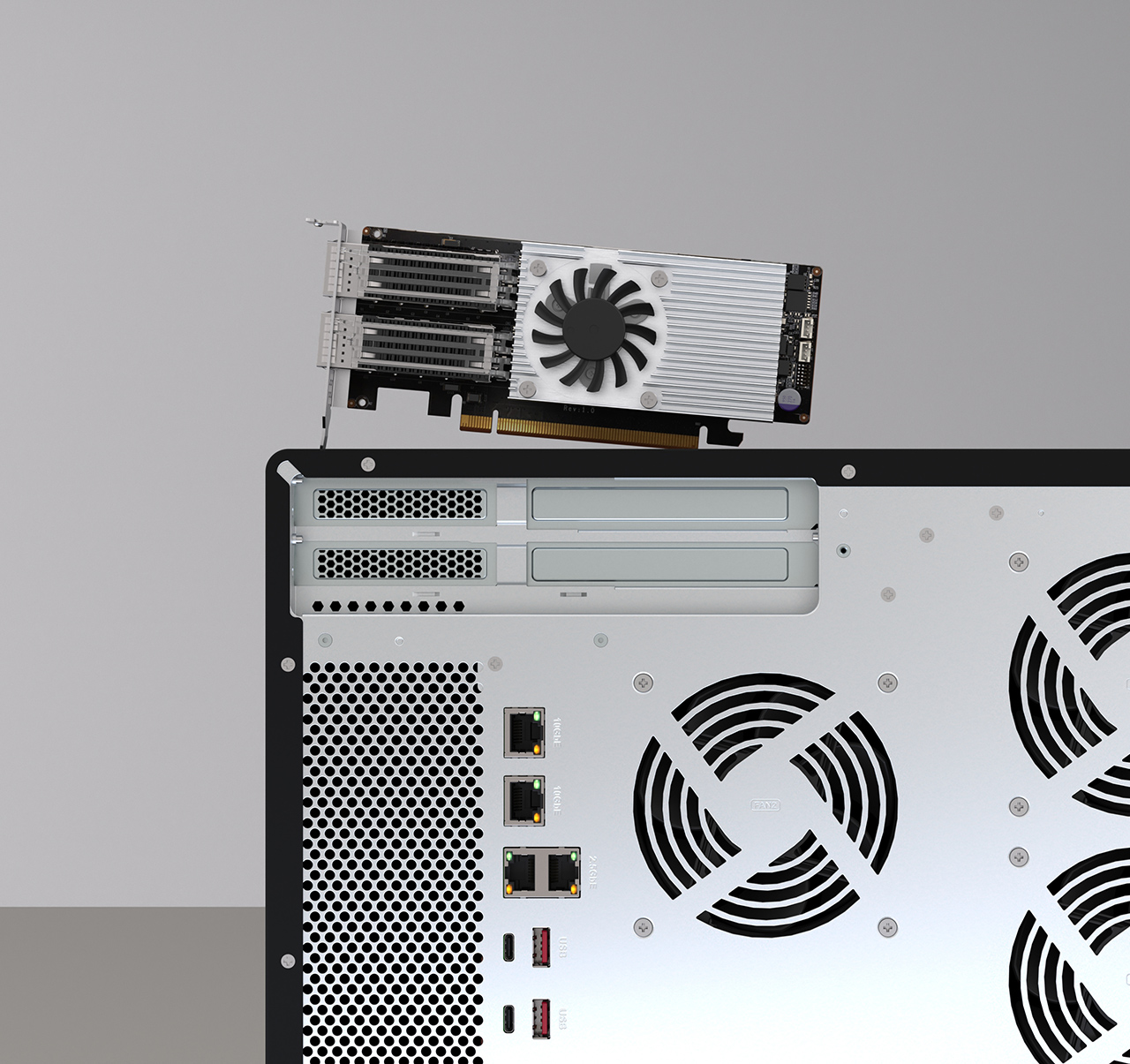 通过 PCIe 扩展卡升级至 25/100GbE,适用于虚拟化、高强度文件访问、媒体传输及高速备份 / 还原任务。