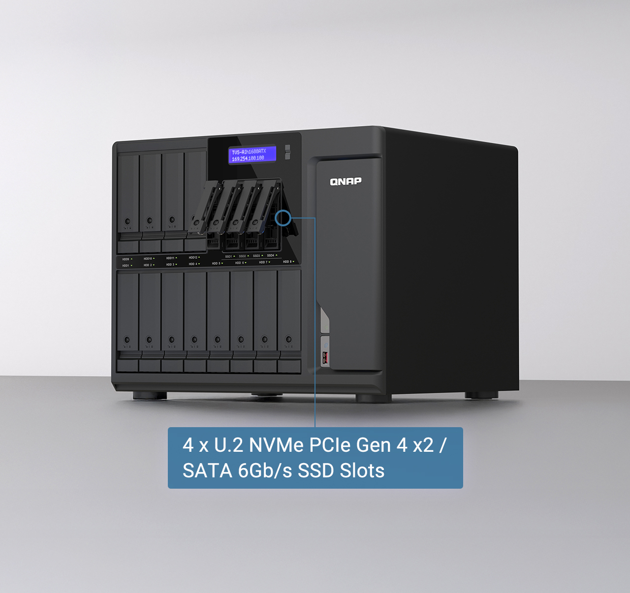TVS-AIh1688ATX 配备四个 2.5 英寸 SSD 插槽,支持高性能 U.2 NVMe PCIe Gen 4 x2 SSD(每槽较高 32 Gb/s)或经济型 SATA 6Gb/s SSD。搭配高速 U.2 NVMe SSD,可大幅提升 AI 应用、虚拟化和多媒体处理等对延迟敏感及高强度任务的性能。