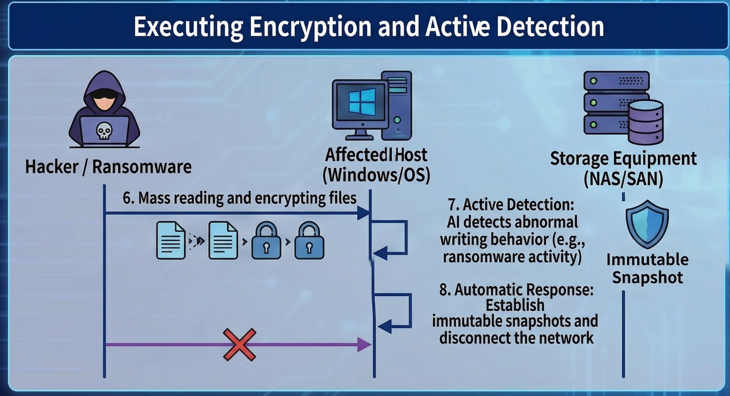 Modern storageunit will monitor the entropy changes of write blocks in real time. If a large number of blocks show abnormal spikes in entropy along with high-frequency writes, the system will determine that an attack is occurring and will automatically trigger immutable snapshots, or even proactively cut off write Permission to the connection (SMB/NFS).